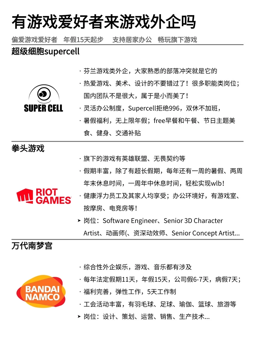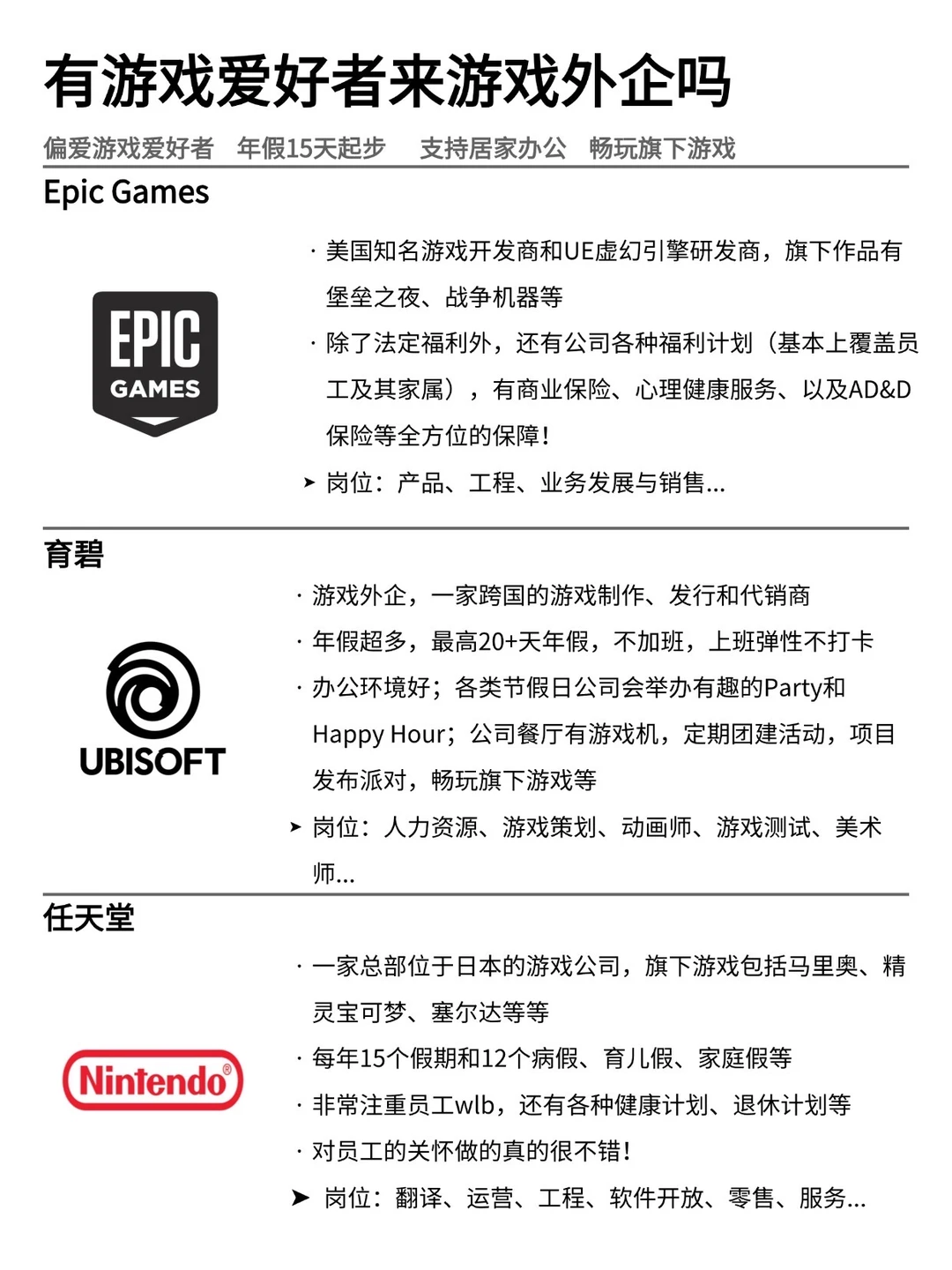 喜欢游戏的小伙伴趁年底捞人力度大,一定要错过游戏外企!游戏类外企简直就是不要太香好吗,今天就给大家盘一波 · 为什么建议去游戏外企 年假平均15天起步,拒绝996,不倡导加班,不开无效会议 有专属游戏福利,各种节日主题活动,氛围超好,每周有居家办公机会 环境平等包容,对女生友好,竞争相对友好,艺术生/设计生专业对口,双非背景也有机会进,门槛友好 · 坚持日更吗,帮大家在找工作路上顺利拿到 offer! · 游戏爱好者 游戏公司 游戏外企 找工作 找工作啊找工作社招#神仙外企 #艺术生就业