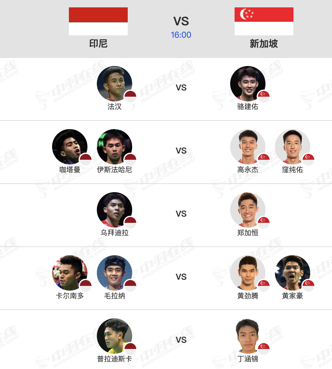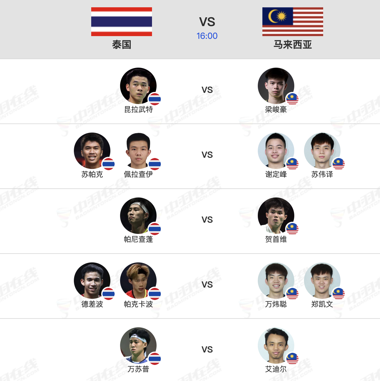 2025东南亚运动会 男团半决赛16点开始【1号场地:泰国🇹🇭 vs 🇲🇾马来西亚】1、昆拉武特 🆚 梁峻豪2、苏帕克/佩拉查伊 🆚 谢定峰/苏伟译3、帕尼查蓬 🆚 贺首维4、德差波/帕克卡波 🆚 万炜聪/郑凯文5、万苏普 🆚 艾迪尔【2号场地:印尼🇮🇩 vs 🇸🇬新加坡】 1、法汉 🆚 骆建佑2、咖塔曼/伊斯法哈尼 🆚 高永杰/窪纯佑3、乌拜迪拉 🆚 郑加恒4、卡尔南多/毛拉纳 🆚 黄劲腾/黄家豪5、普拉迪斯卡 🆚 丁涵锦