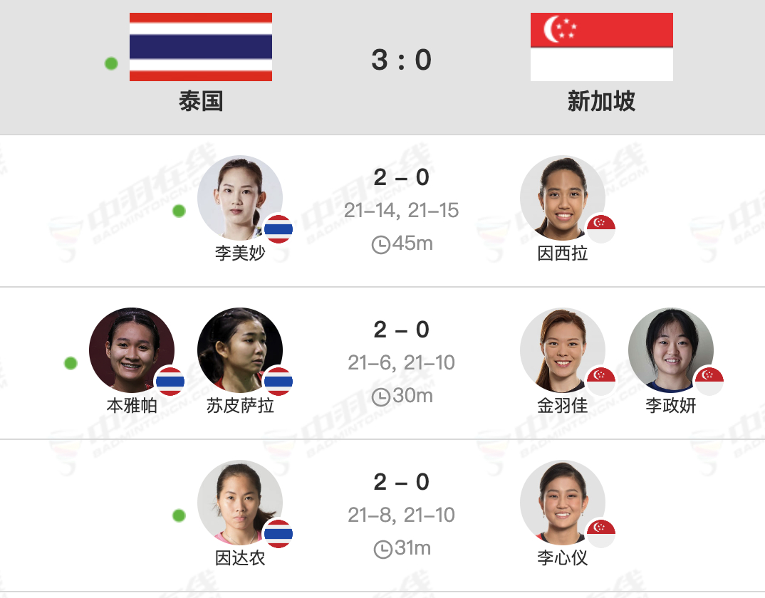 2025东南亚运动会 泰国女队晋级决赛!【泰国🇹🇭 3-0 🇸🇬新加坡】1、李美妙 21-14、21-15因西拉2、本雅帕/苏皮萨拉 21-6、21-10 金羽佳/李政妍3、因达农 21-8、21-10 李心仪4、奥恩尼卡/杰尼查 🆚 李政虹/TAY5、革通 🆚 许妤欣