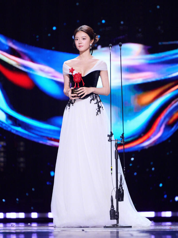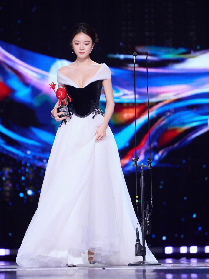 赵今麦亮相爱奇艺尖叫之夜,身着AADNEVIK 2026春夏系列落肩撞色裙装亮相红毯,佩戴全套Pomellato宝曼兰朵珠宝,不费力的美貌,灵动又大方的气质是独一份
