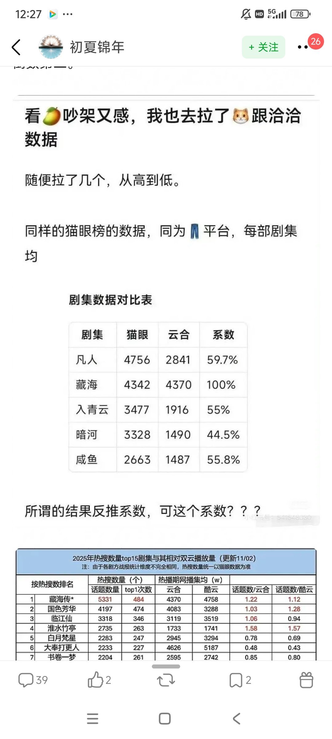 一拉表就发现有人的云合播放数据异常。电视剧领域的虚假数据太多了,至今没有一个统一的播放量数据,造假的空间太大。电影票房至少是透明的,虽然有预售造假产业链,但人家也是走流程的,纸面数据都是统一的标准。