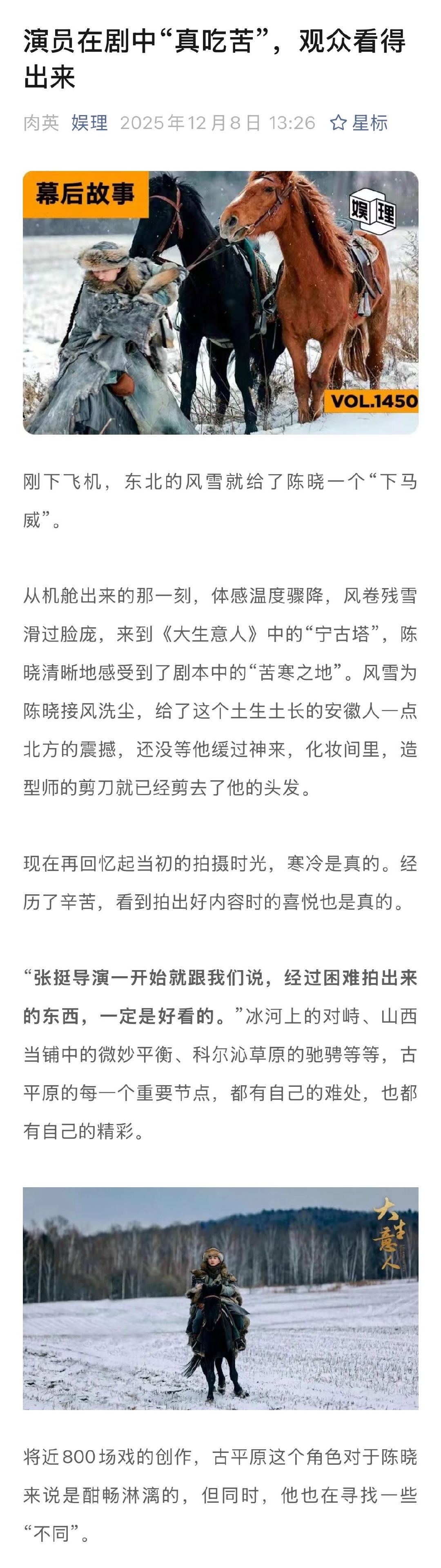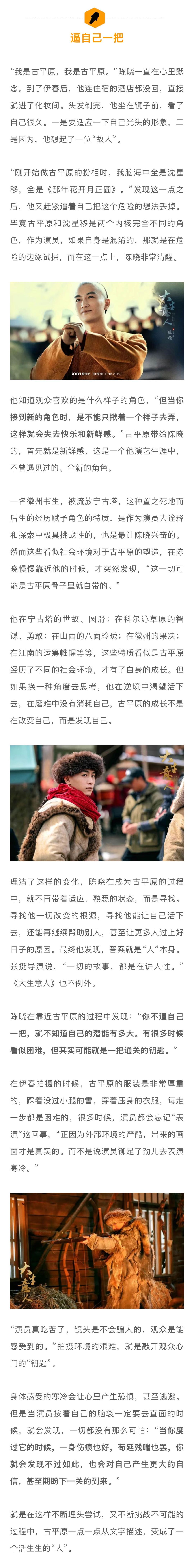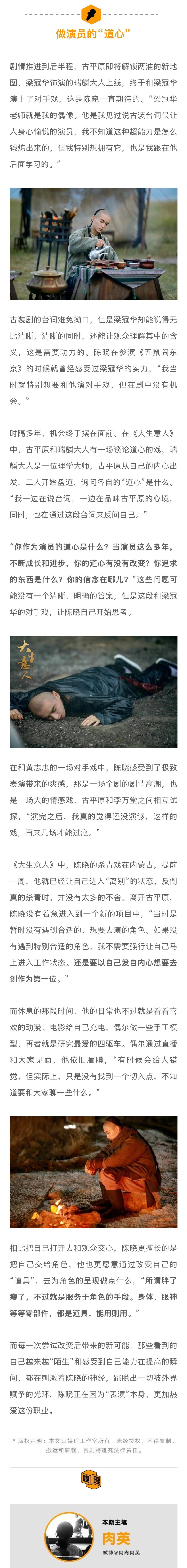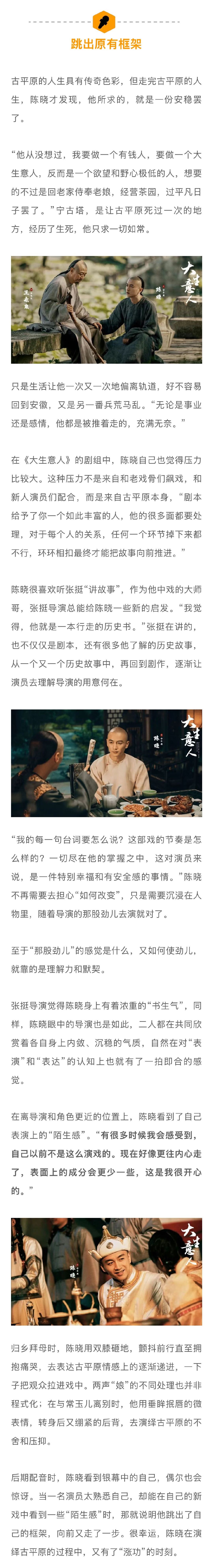 陈晓说身体眼神是服务角色的 陈晓回应被说有书生气 《大生意人》导演张挺觉得身上有着浓重的“书生气”,同样,陈晓眼中的导演也是如此。在离导演和角色更近的位置上,陈晓看到了自己表演上的“陌生感”。“有很多时候我会感受到,自己以前不是这么演戏的。现在好像更往内心走了,表面上的成分会更少一些,这是我很开心的。” 陈晓回应瘦好多 ↓