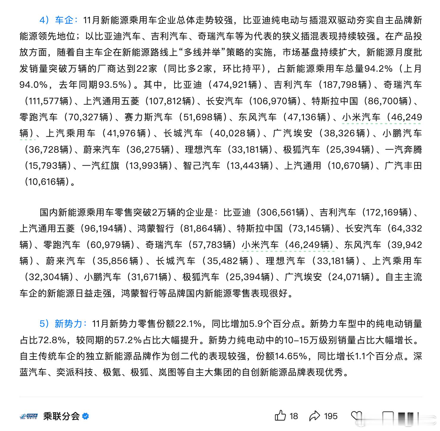 乘联会11月新能源数据——比亚迪,批发474,921辆,零售306,561辆;特斯拉,批发86,700辆,零售73,145辆;(犹记上个月某媒体报道3Y双双暴跌...)鸿蒙智行,零售 81,864辆;小米,批发零售均为 46,249辆;小鹏,批发36,728辆,零售31,671辆;蔚来,批发36,275辆,零售35,856辆;理想,批发零售均为 33,181辆。
