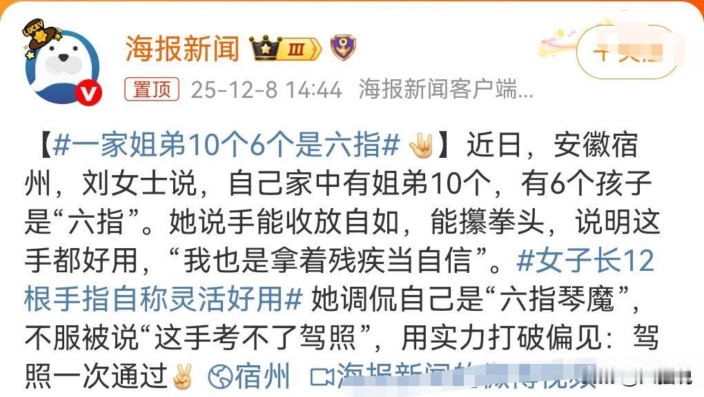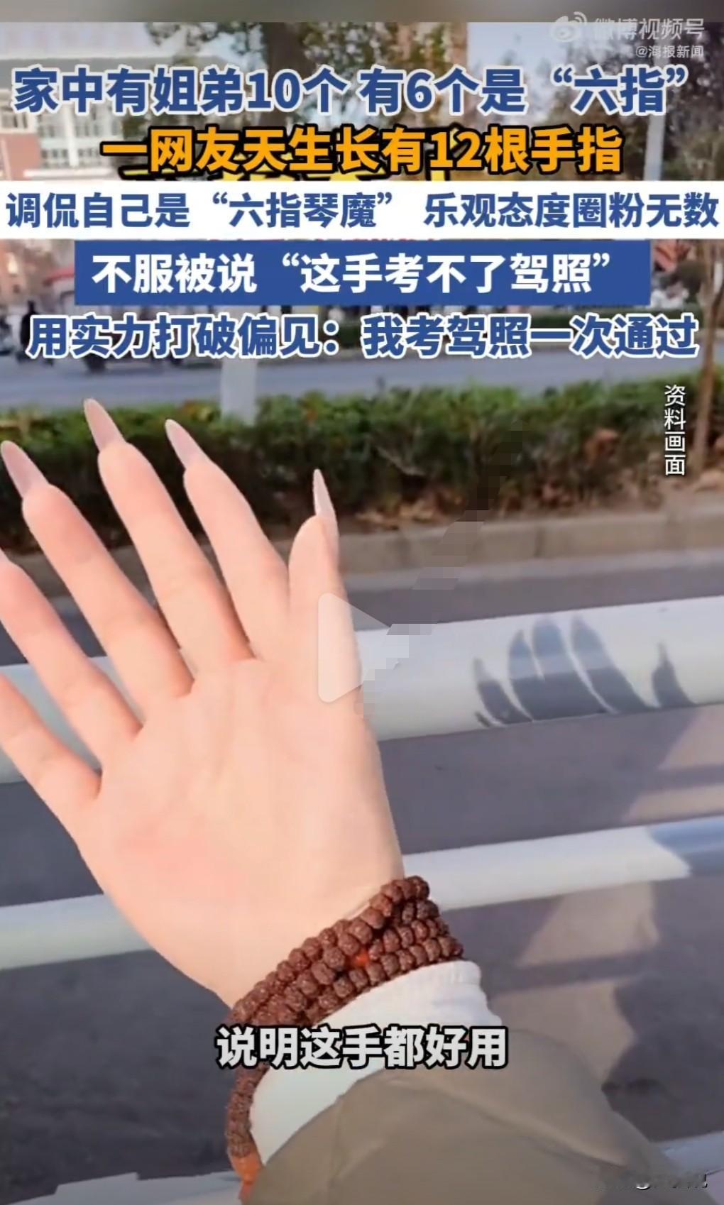 感觉有那么一点点吓人。 一家姐弟10个,6个是六指。 不影响功能,只是外观存在着差异而已。 不过绝大多数人都只有五指。 有6个指头确实有点怪怪的。 如果是结婚的话,会担心会不会遗传。 有人说这样的手考不了驾照,那肯定是没有科学根据的。 一女子六指考了驾照,而且是一次性通过。 而且靠着乐观的态度,有很多的粉丝。