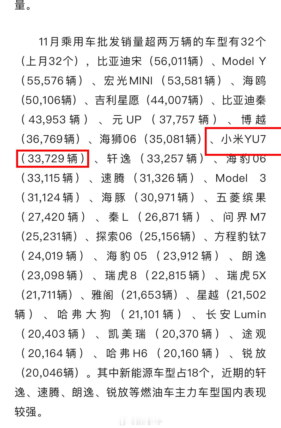 小米11月汽车销量46249台,其实小米YU7 33729台,小米su7 12520台。