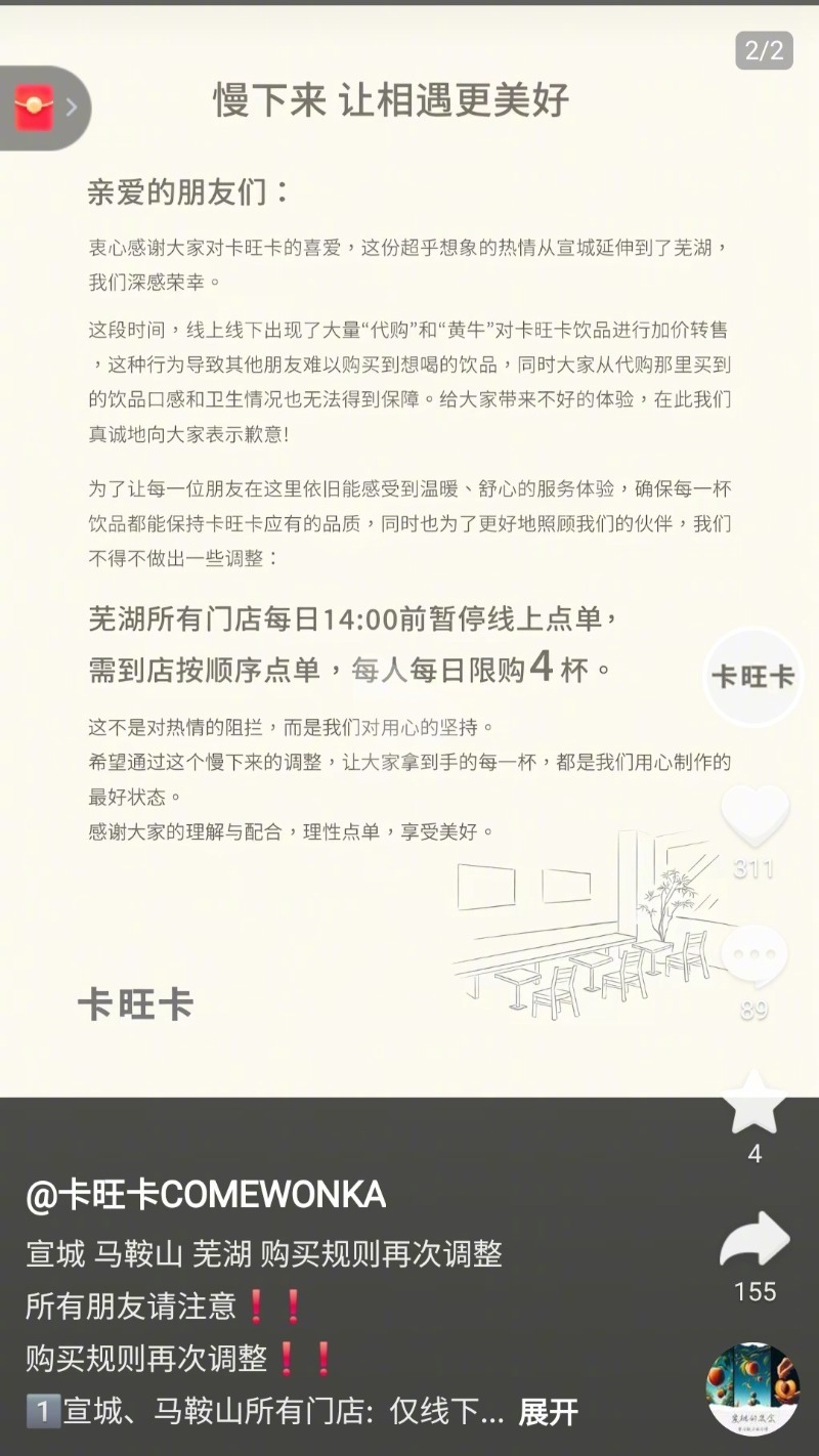 #广德三件套消费热蔓延至周边多地#【#安徽卡旺卡多家门店实行限购#】近日,炖锅、奶茶、桃酥——广德“三件套”带火皖南小城,这一波消费热潮甚至从广德蔓延至周边芜湖、马鞍山等地。12月8日下午13:44分,卡旺卡点单小程序上,广德门店显示“前方494杯茶饮制作中”,芜湖、马鞍山多家门店提醒“目前待做杯数过多,可至现场下单。”12月8日上午,卡旺卡在社交平台发布“宣城、马鞍山、芜湖购买规则再次调整”的信息,其中表示,宣城、马鞍山所有门店仅线下点单,每人每日限购4杯;芜湖所有门店每日14点前暂停线上点单,需到店按顺序点单,每人每日限购4杯。(大皖新闻)详戳:应对“黄牛”“代购”泛滥,卡旺卡多地门店实行“每人每日限购4杯”
