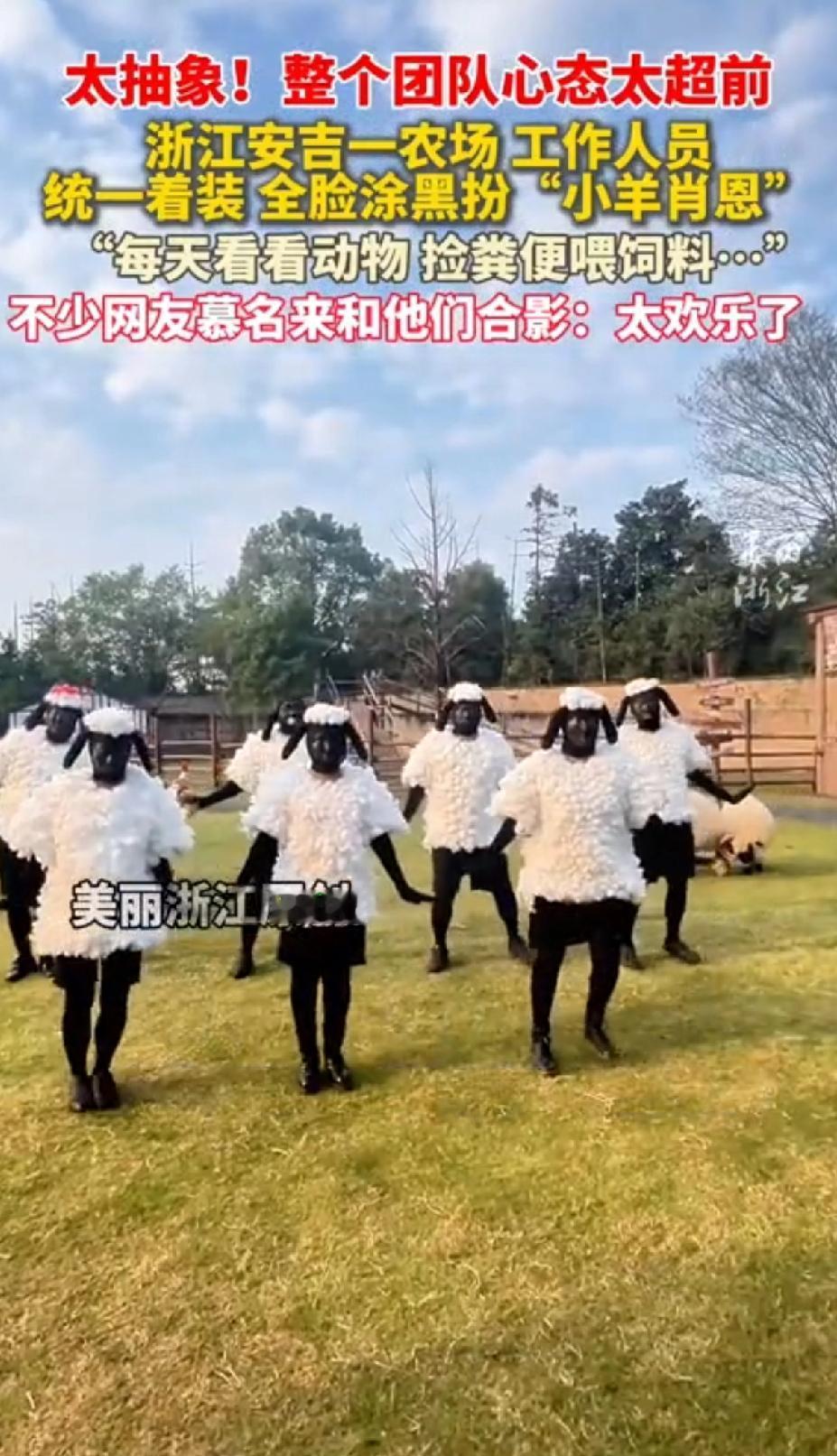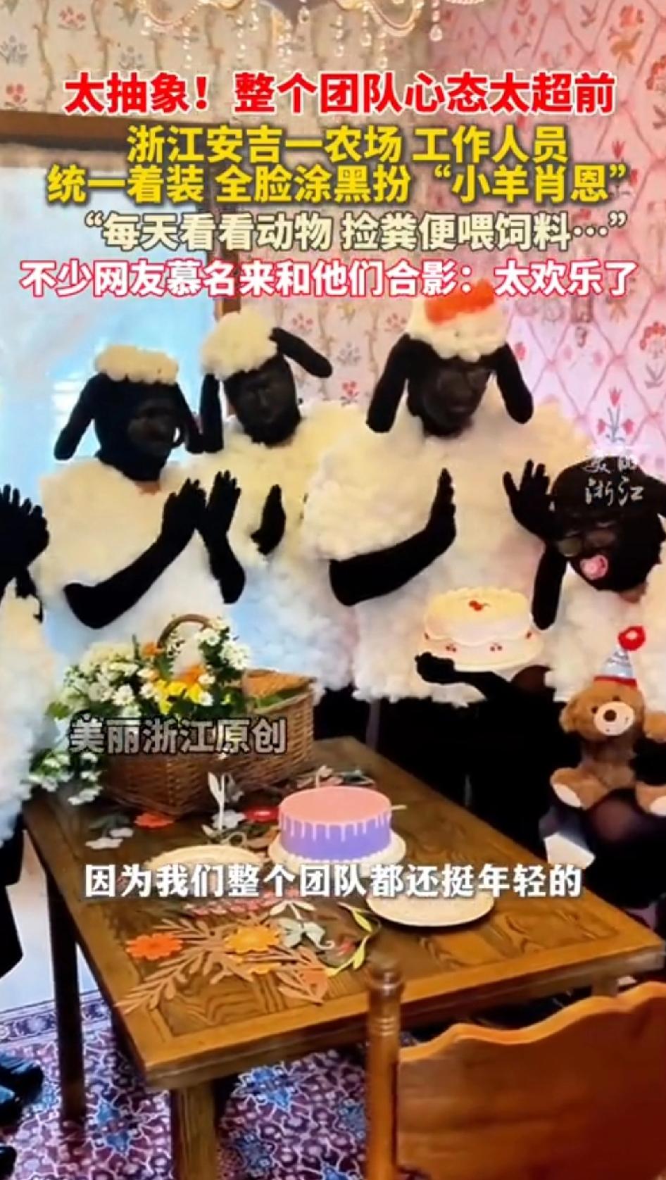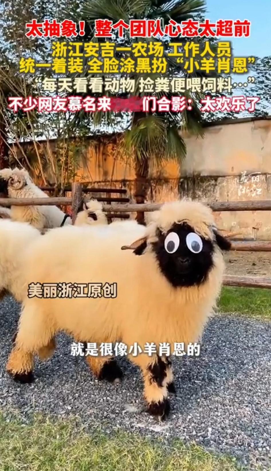 哈哈…太抽象了!整个团队心态都太超前了。 浙江安吉一农场,所有工作人员统一装扮,全脸涂黑“扮”小羊肖恩。 工作人员每天看看动物,捡粪便照顾小羊。 工作人员李女士说上班先换“打工羊”衣服,还会照顾农场里来自世界各地的动物,主角是像小羊肖恩的瓦莱黑鼻羊。 不少网友慕名来合影,都说太欢乐了。 我在想在那里上班的工作人员,他们看到各自的装扮,又浑身漆黑,每天都很欢乐吧? 现在安吉吸引了很多年轻人来创业,95 后俞佳慧回乡开休闲农场,90 后李汪兢把设计部门搬到乡村。 网红农场即将诞生,这样的宣传太有特色了,去游玩的人一定很欢乐。 这些年轻人给安吉带来了新业态,也让乡村更有活力,这农场的创意装扮就是最好的证明!