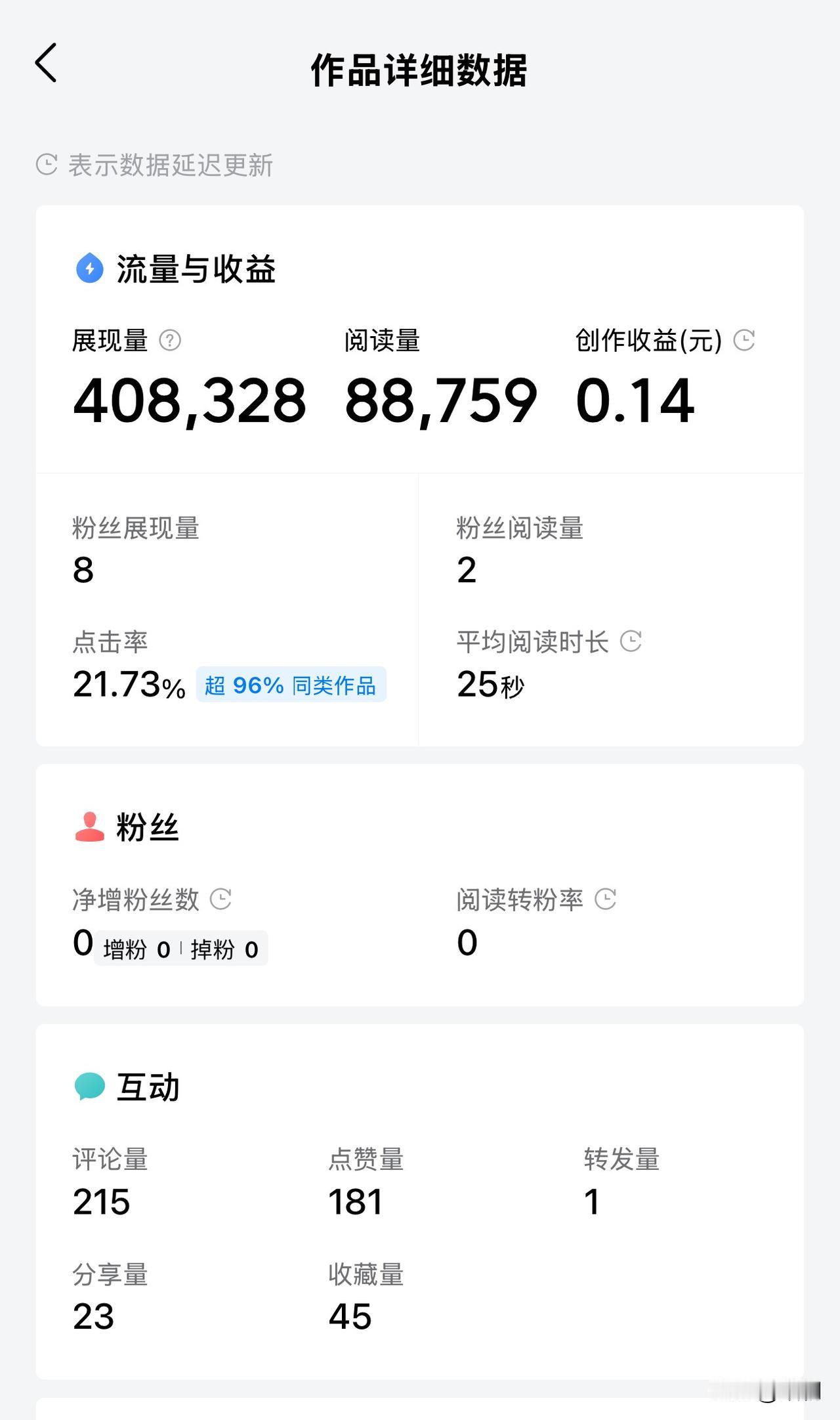 哇,爆了爆了,终于平台给我流量了 40多万的展现,8万多阅读量,昨天发布的一天微头条突然就推流了 非常感谢平台和朋友们的喜欢,刚来头条创作没多久,今天有这样的数据,这无疑是给了我非常大的动力 说实话,经常能刷到别人的爆款,总想着什么时候我也能有这样的好运,但今天给到我这样的数据之后,我除了高兴之外,还是有一点担忧的 因为能想得到这种好运也不是天天有,肯定要隔一段时间,在不经意间才会有这种爆款文章出现 对于这种数据的起伏,对于自己来说,心态方面也需要放平一点,确实也是一个不小的考验 也是希望接下来能越来越好吧