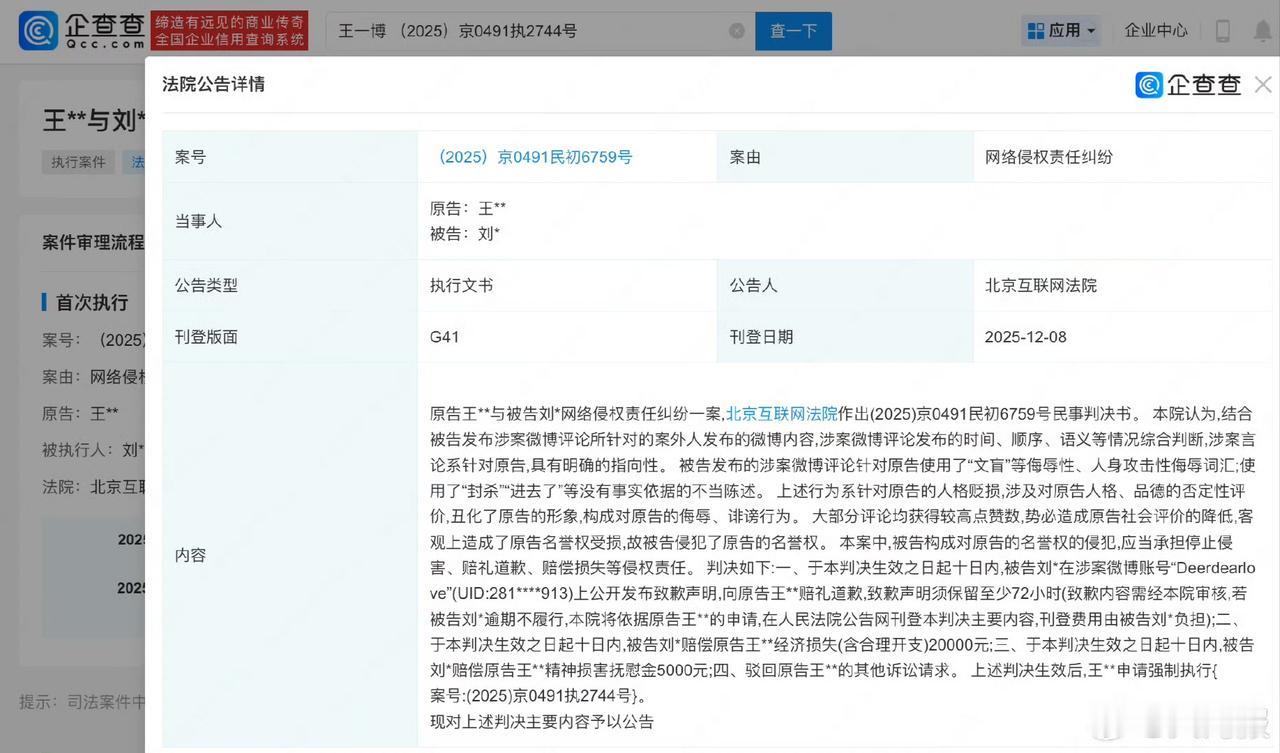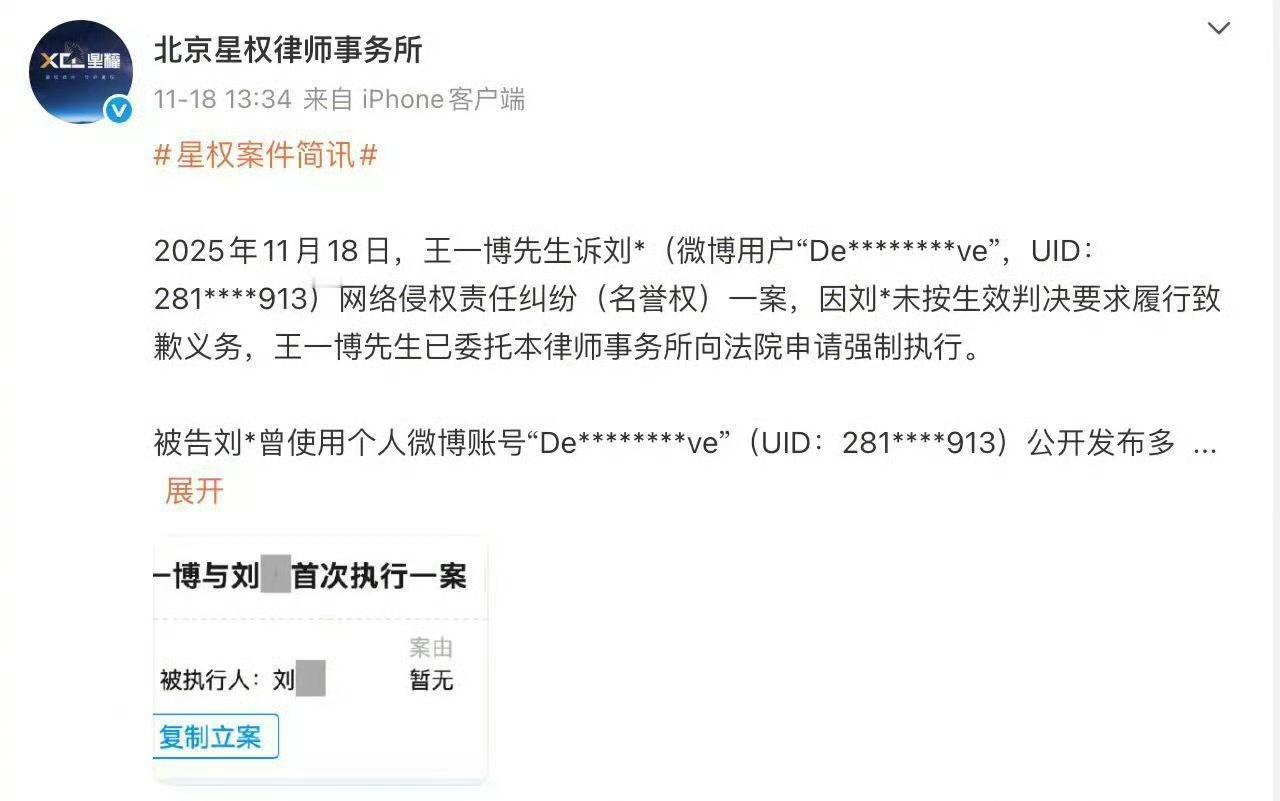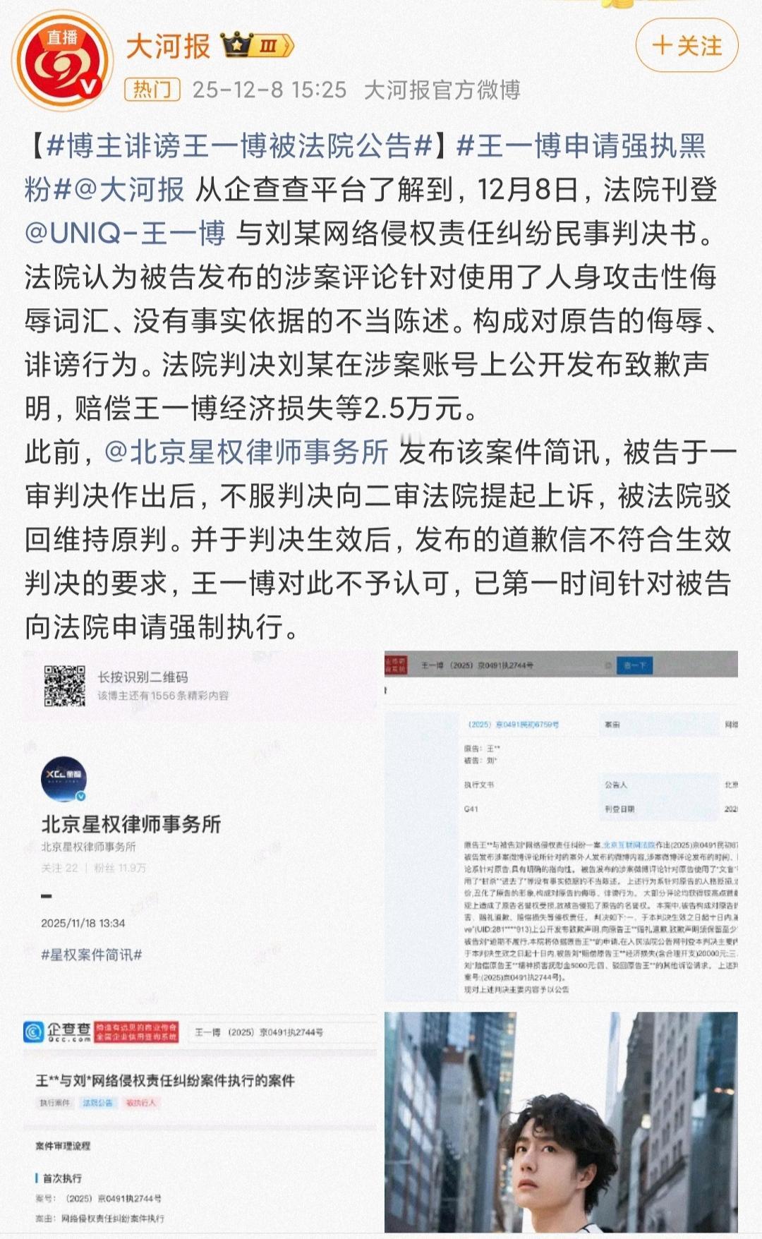 王一博起诉刘某案更新!就是上次被判公开道歉,却毫不悔改投机取巧不好好道歉那个!还有脸上诉,结果被法院驳回维持原判!👏🏻 刘某最终被判在涉案账号上公开发布致歉声明,赔偿王一博经济损失等2.5万元。 网络并非法外之地,脂粉氵军再有恃无恐也不能逃脱法律的制裁! 支持王一博先生维权! 博主诽谤王一博被法院公告