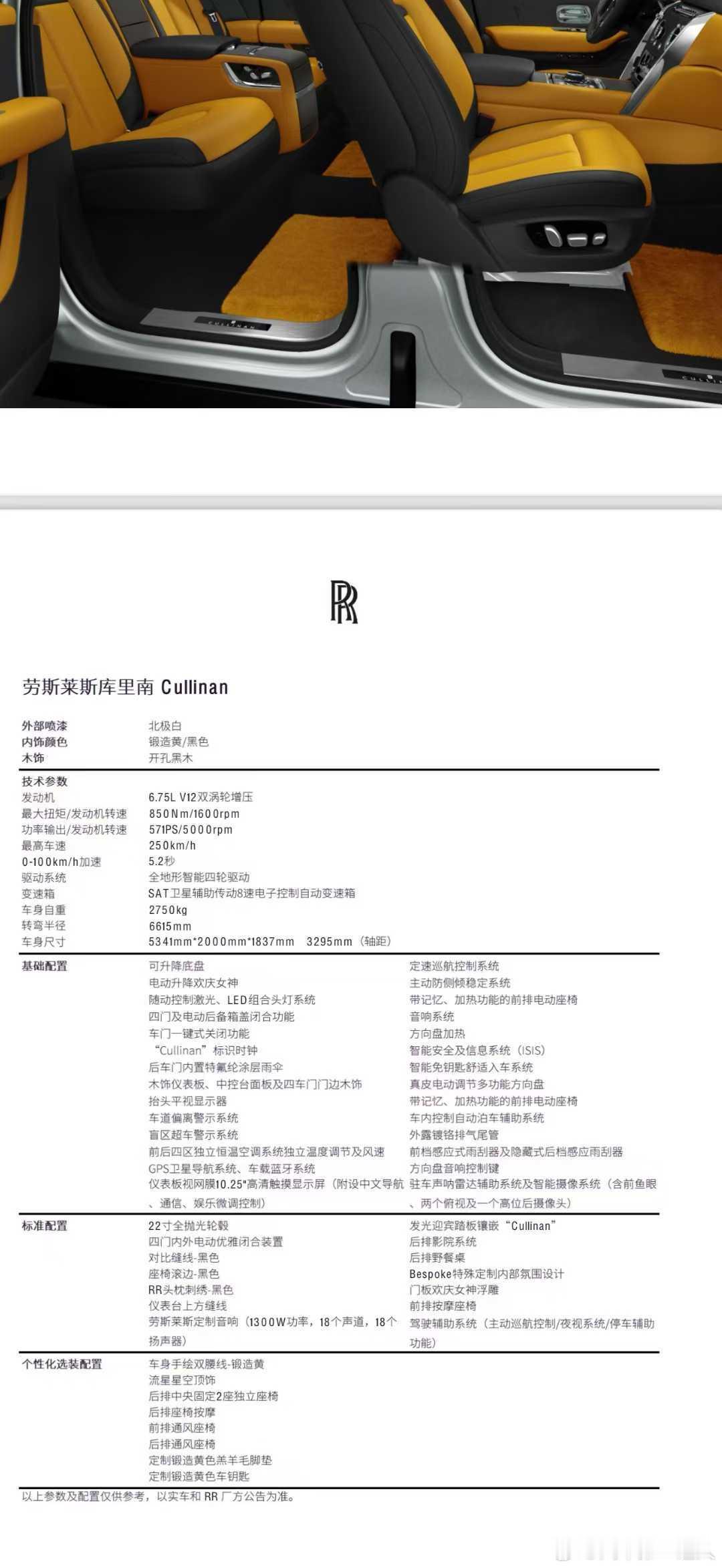 劳斯莱斯 库里南 四座版,24年上牌4400公里,北极白/锻造黄配色,带流星顶·双腰线·座椅通风·定制音响·后排娱乐等