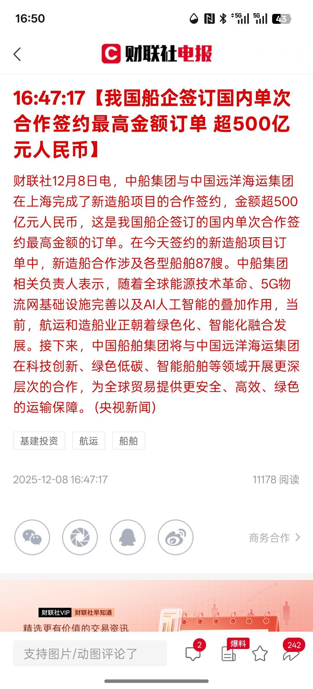 我国船企签订国内单次合作签约最高金额订单 超500亿元人民币。随着中国的科技快速的发展,人工智能的技术持续创新也带来了新的发展方向,新的发展机遇!5G网络的不断完善,让AI人工智能的技术起到了叠加作用。未来的船舶工业将慢慢的转向智能化时代的发展!现在全球也进入了能源革命时代,未来就是低碳运行,绿色环保的能源供给!在船舶上的转型是非常成功的!未来的制造船舶行业将不是传统化的,这是智能化的船舶时代!