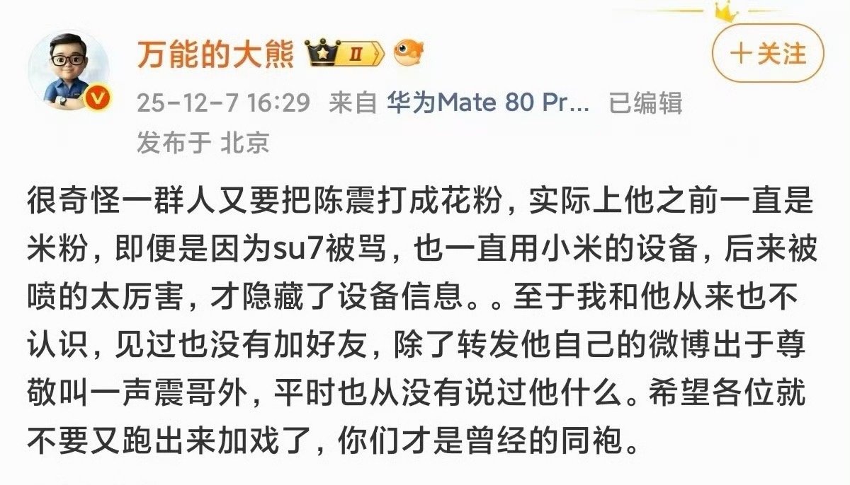 大熊说:米粉网暴陈震,不承认陈震是米粉。大熊又说:陈震算什么花粉,就是米粉。所以大熊是米粉,还网暴陈震??一时间不知道该说啥,这回转镖回的…