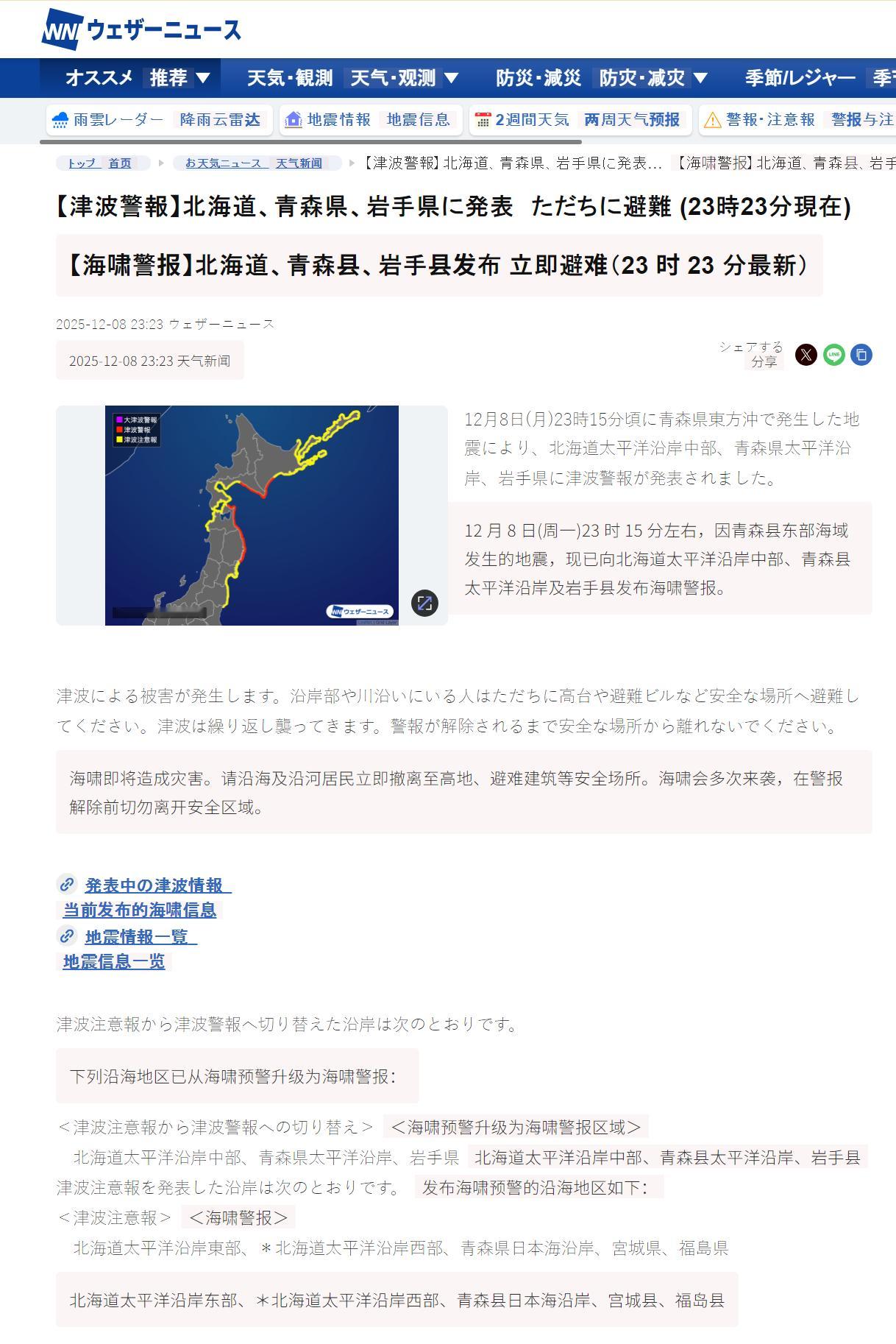 🔻受地震影响,日本发布海啸警报:北海道太平洋沿岸中部、青森县太平洋沿岸及岩手县。日本地震 热点现场海外新鲜事