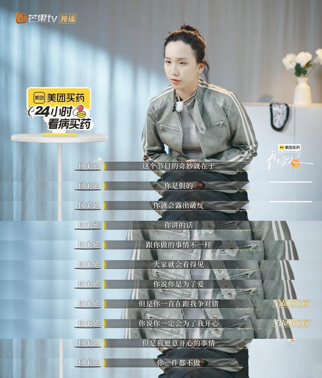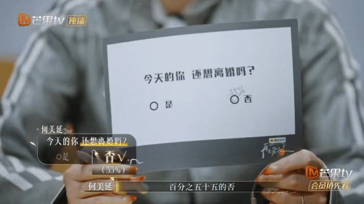 何美延选择是否离婚时动摇了何美延选择是否离婚时动摇了!在本次的选择当中,何美延虽然选择了“否”但也标明了“55%”,说明自己的内心已经在逐渐开始动摇,同时她也表示:发生的事情太多不是三言两语就能说明白的。也许是在当日的相处过程中,面罩事件终究没有得到合理的解决,厕所外的谈话被误会,以及延伸出的自己并没有得到梁淞口中真正的“重视”,梁淞的“言行不一”......让美延的内心开始不太坚定 再见爱人