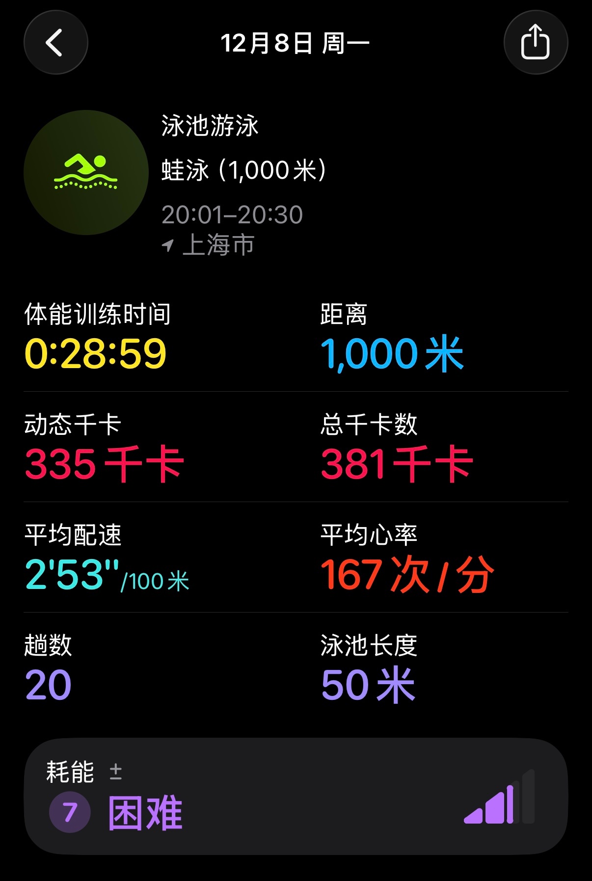 11月比较忙,没能坚持每天游泳,12月继续努力,今天算是近期的个人最好成绩,但还有很大的进步空间,在考虑重新学习自由泳了。20出头的时候,对一切都充满好奇心,也乐于学习新东西。明年就30了,仍有好奇心的,大概就只剩汽车了。