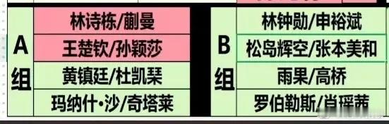 国乒两对混双同组,混双规则有利两组晋级。 混双抽签结束,国乒莎头和栋曼同在A组,让人一惊。不过查过混双规则,还真不错。 混双规则:8对组合分成两组,每组进行循环赛,每组前两对组合晋级。之后A组第一与B组第二、B组第一与A组第二进行半决赛。 国乒只要确保循环赛中,拿到小组前二,两对就可同时晋级半决赛,且半决赛不交手。 A组还有中国香港黄镇廷/杜凯琹组合和印度玛纳什·沙和奇塔莱组合。 莎头组合栋曼组合加油,争取会师决赛!