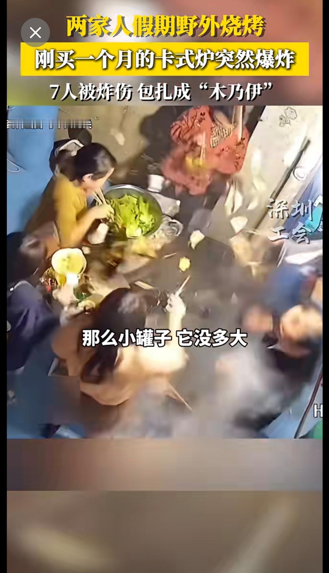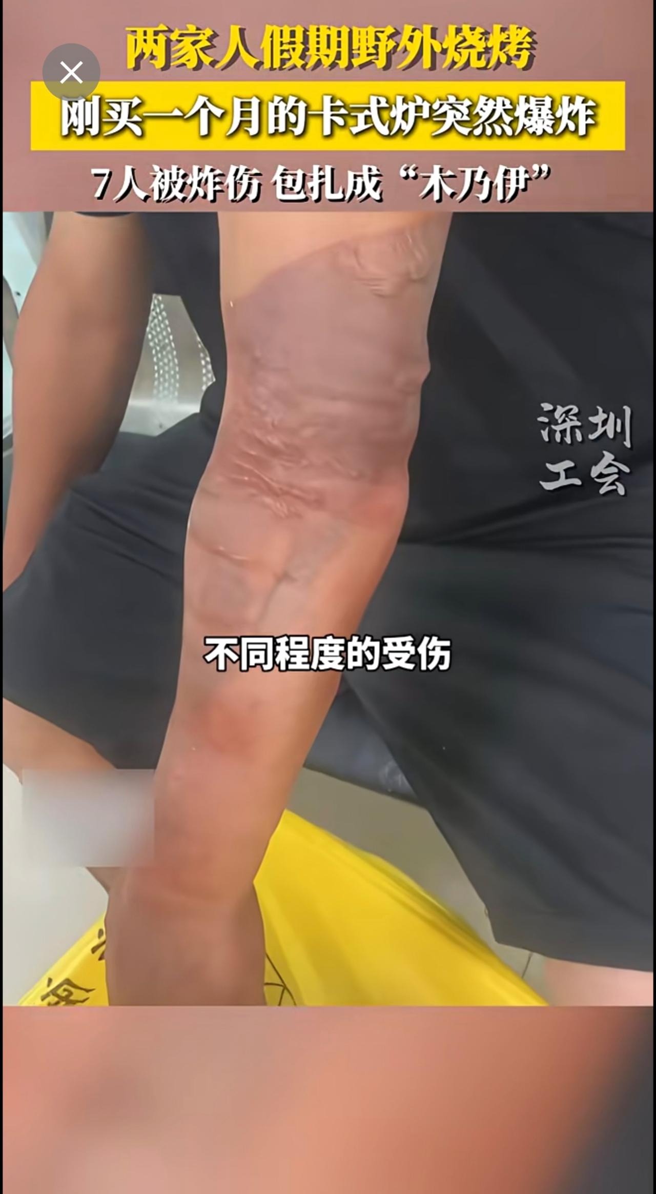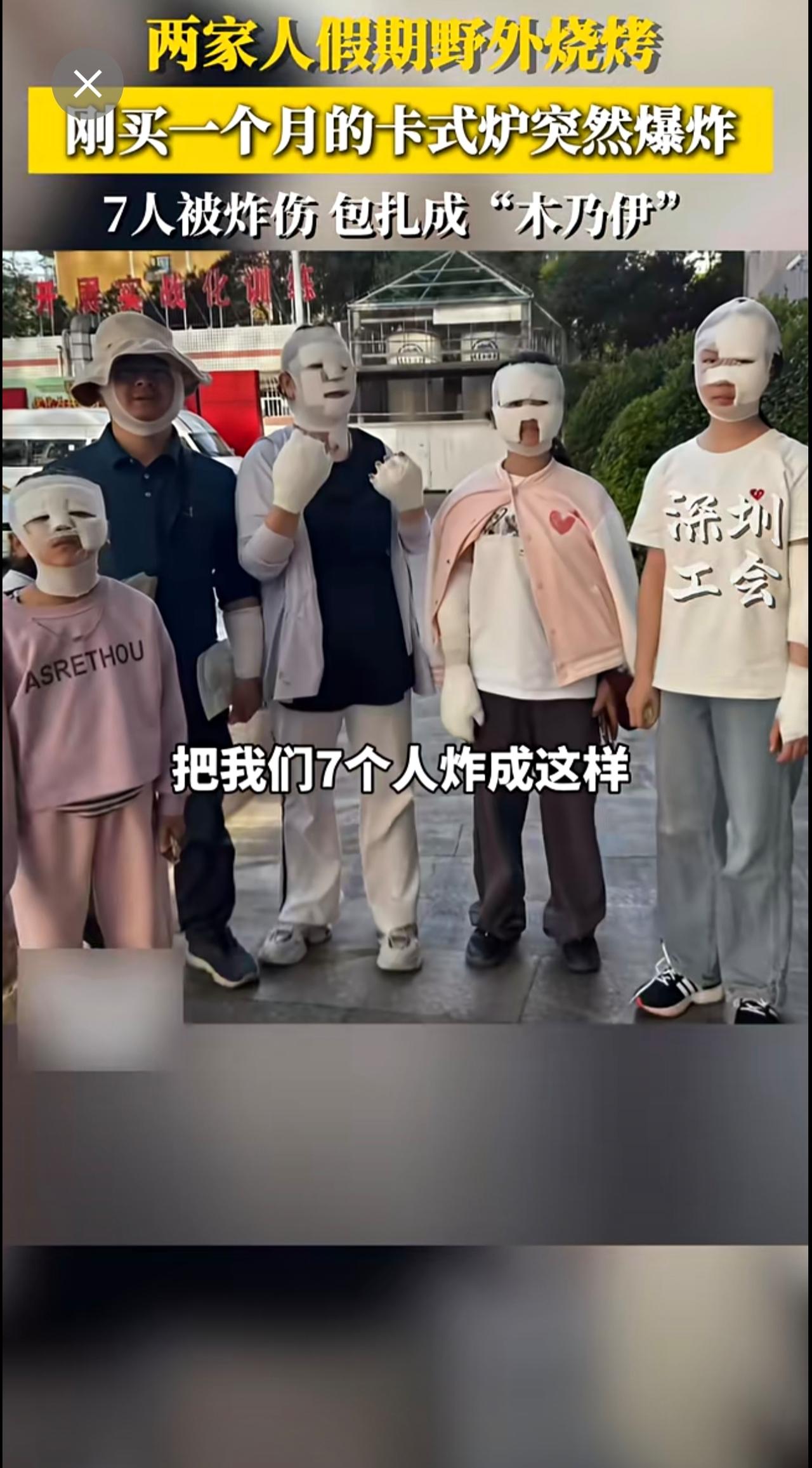 两家人假期野外烧烤,刚买一个月的卡式炉突然爆炸,七人被炸伤,包扎成木乃伊~来源: