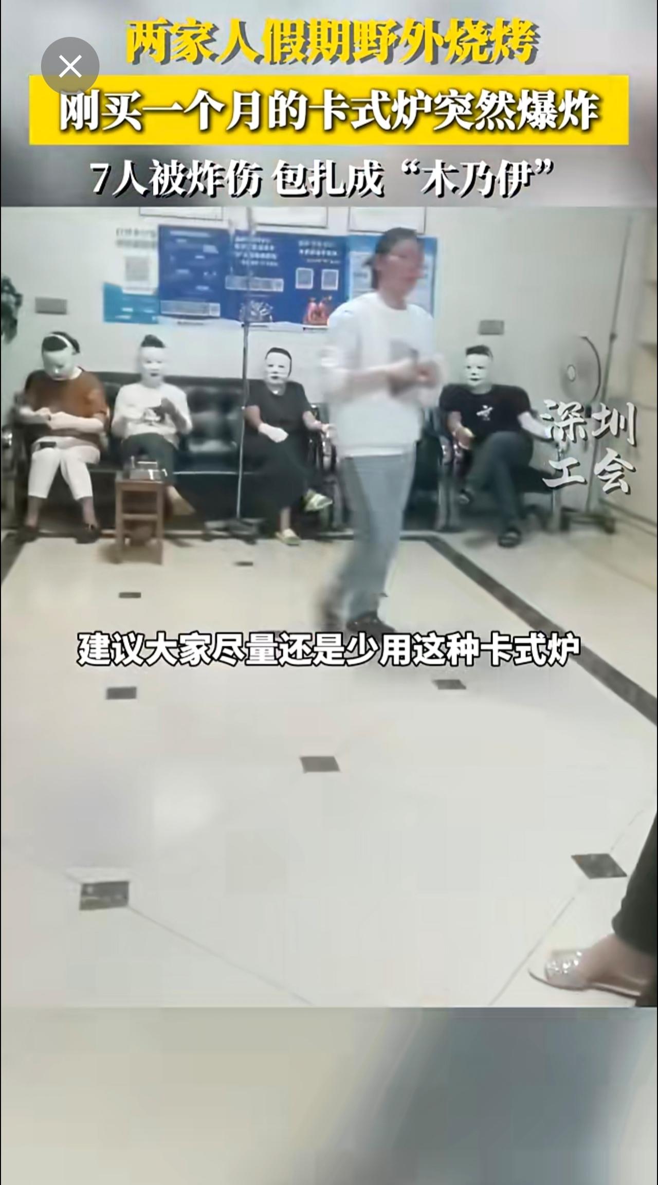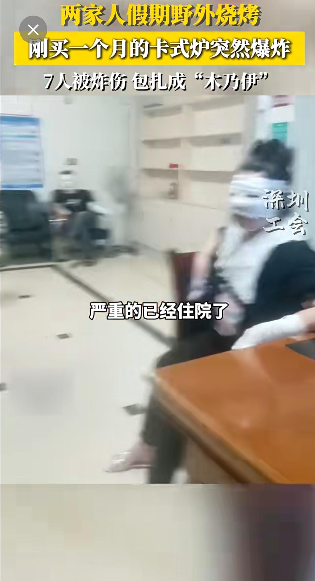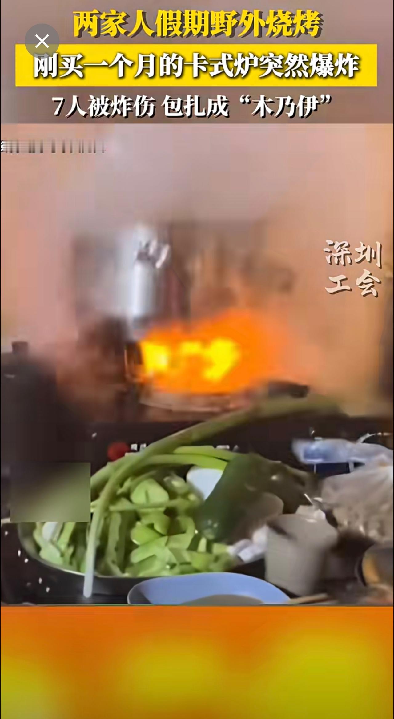 两家人假期野外烧烤,刚买一个月的卡式炉突然爆炸,七人被炸伤,包扎成木乃伊~来源:
