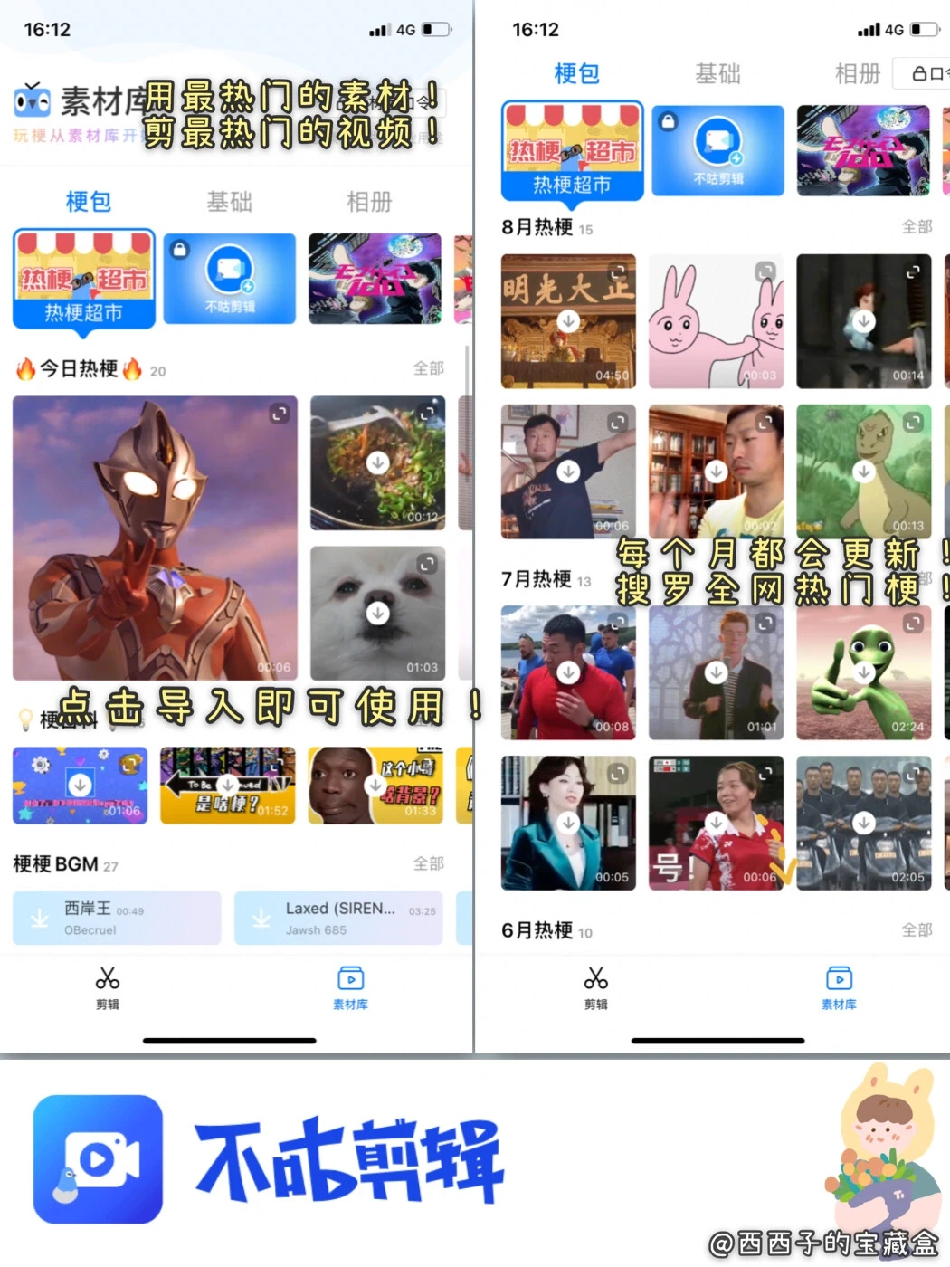 5⃣️海量素材热门梗包每月都会更新,导入即可使用,让你的素材库一直在冲浪前线!