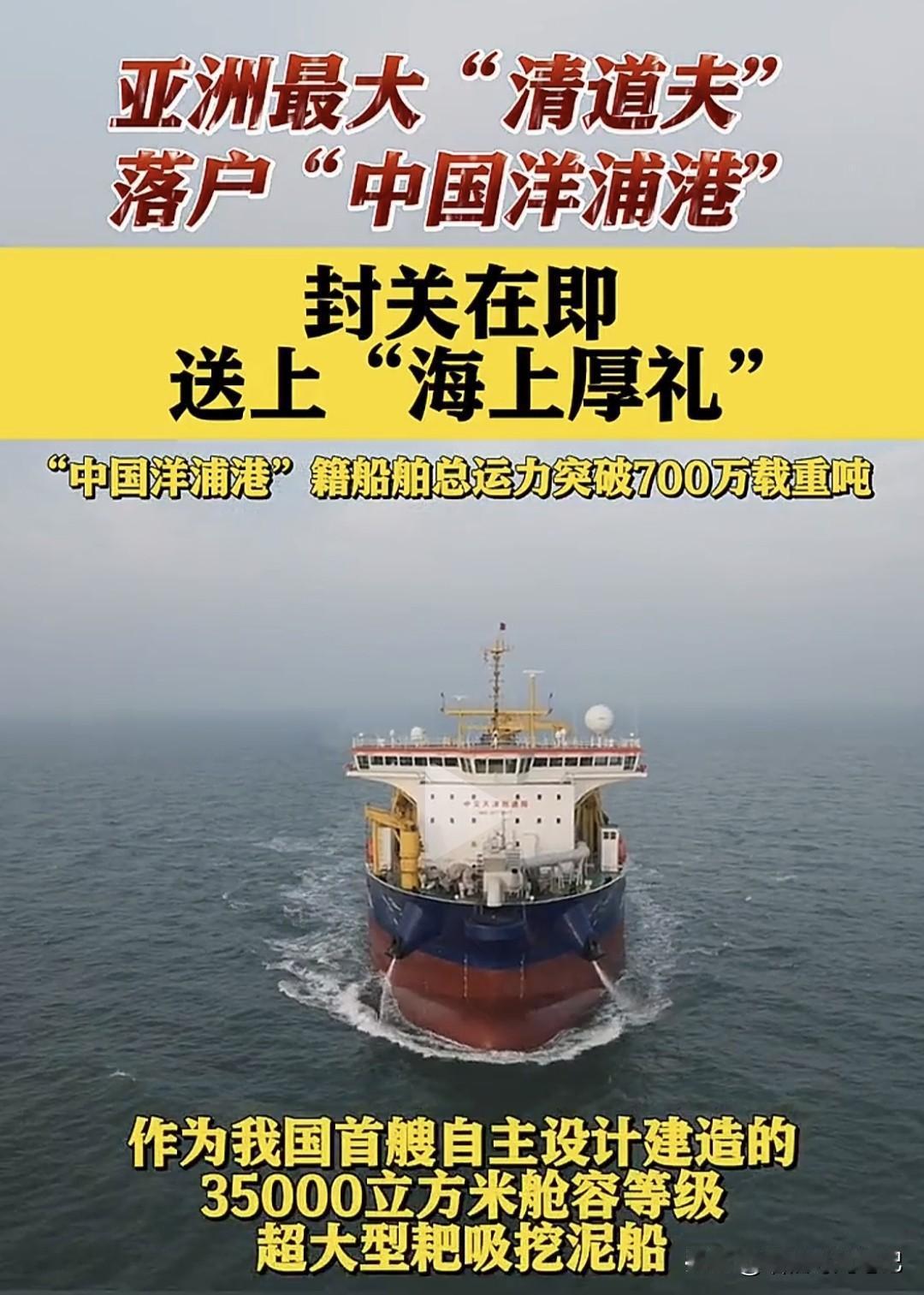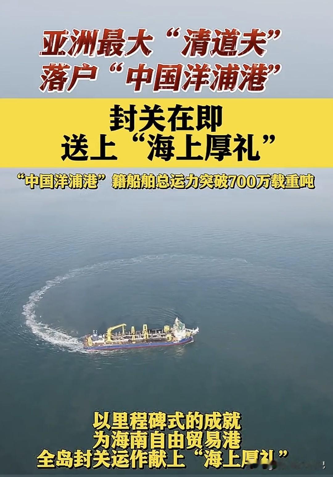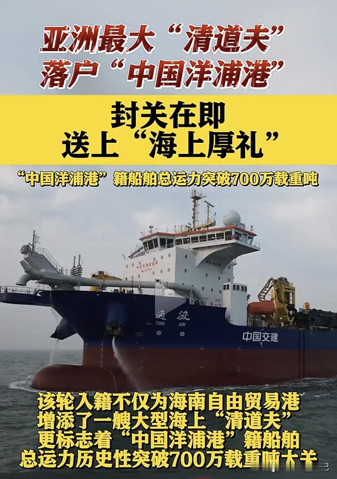 今天,一条“大鲶鱼”悄悄游进海南——亚洲最大耙吸式挖泥船“通浚”轮正式把户口落在“中国洋浦港”! 别小看它,这家伙一肚子能吞35000方海泥,甲板长度拉满918米,相当于3个足球场,堪称“海上吸尘器Plus”。 它是咱们纯国产、纯自主设计,打破国外技术卡脖子,直接让洋浦港籍船舶总运力冲破700万载重吨,把全国自贸区都甩在身后。 以后,无论是拓宽航道、修复岸线,还是给万吨巨舰“腾车位”,它都能一边听歌一边“吸”,效率嗖嗖的。海南自贸港封关倒计时,有了这位“清道夫”坐镇,等于给海上高速加了条超车道,全球货轮想来海南“打卡”,排队时间直接砍半。 船还是那艘船,但背后的意义是——中国把维护自家“蓝色国土”的钥匙,牢牢攥在了自己手里。