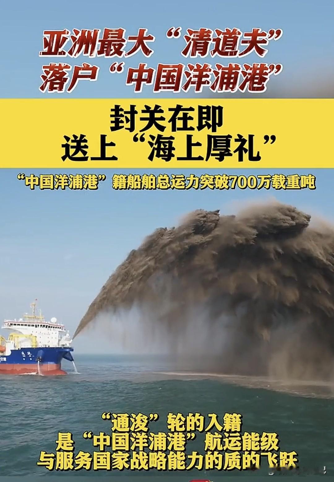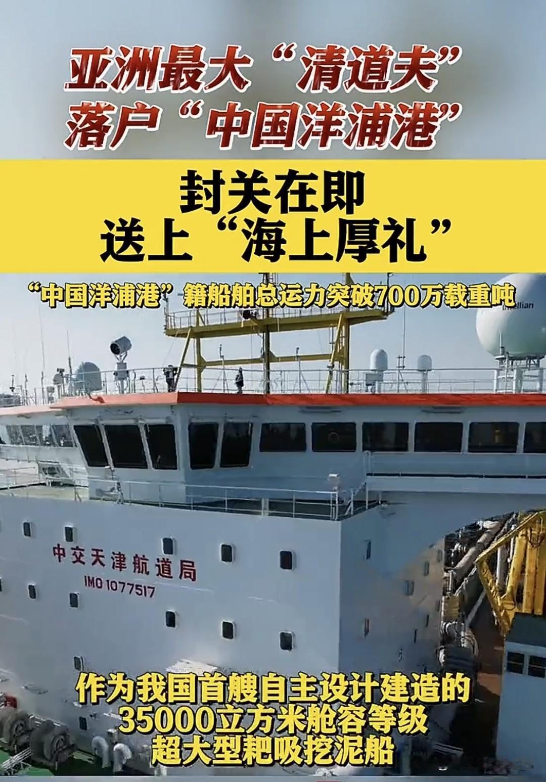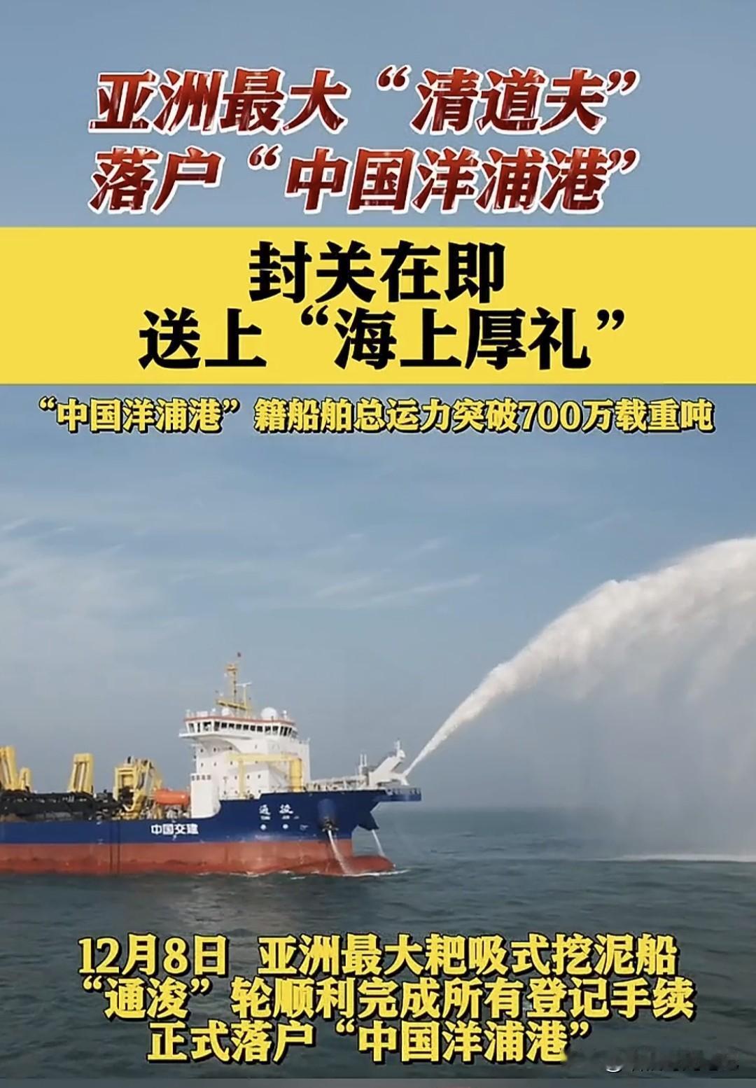 今天,一条“大鲶鱼”悄悄游进海南——亚洲最大耙吸式挖泥船“通浚”轮正式把户口落在“中国洋浦港”! 别小看它,这家伙一肚子能吞35000方海泥,甲板长度拉满918米,相当于3个足球场,堪称“海上吸尘器Plus”。 它是咱们纯国产、纯自主设计,打破国外技术卡脖子,直接让洋浦港籍船舶总运力冲破700万载重吨,把全国自贸区都甩在身后。 以后,无论是拓宽航道、修复岸线,还是给万吨巨舰“腾车位”,它都能一边听歌一边“吸”,效率嗖嗖的。海南自贸港封关倒计时,有了这位“清道夫”坐镇,等于给海上高速加了条超车道,全球货轮想来海南“打卡”,排队时间直接砍半。 船还是那艘船,但背后的意义是——中国把维护自家“蓝色国土”的钥匙,牢牢攥在了自己手里。