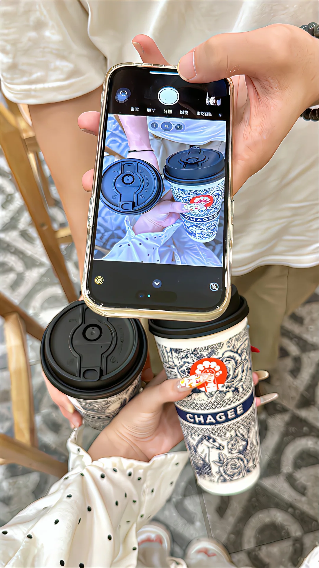 6️⃣从上往下俯拍!!手持饮品🍸放在画面正中心!!