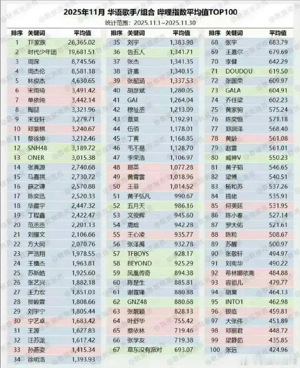 王橹杰、陈奕恒登上11月华语歌手搜索指数TOP100