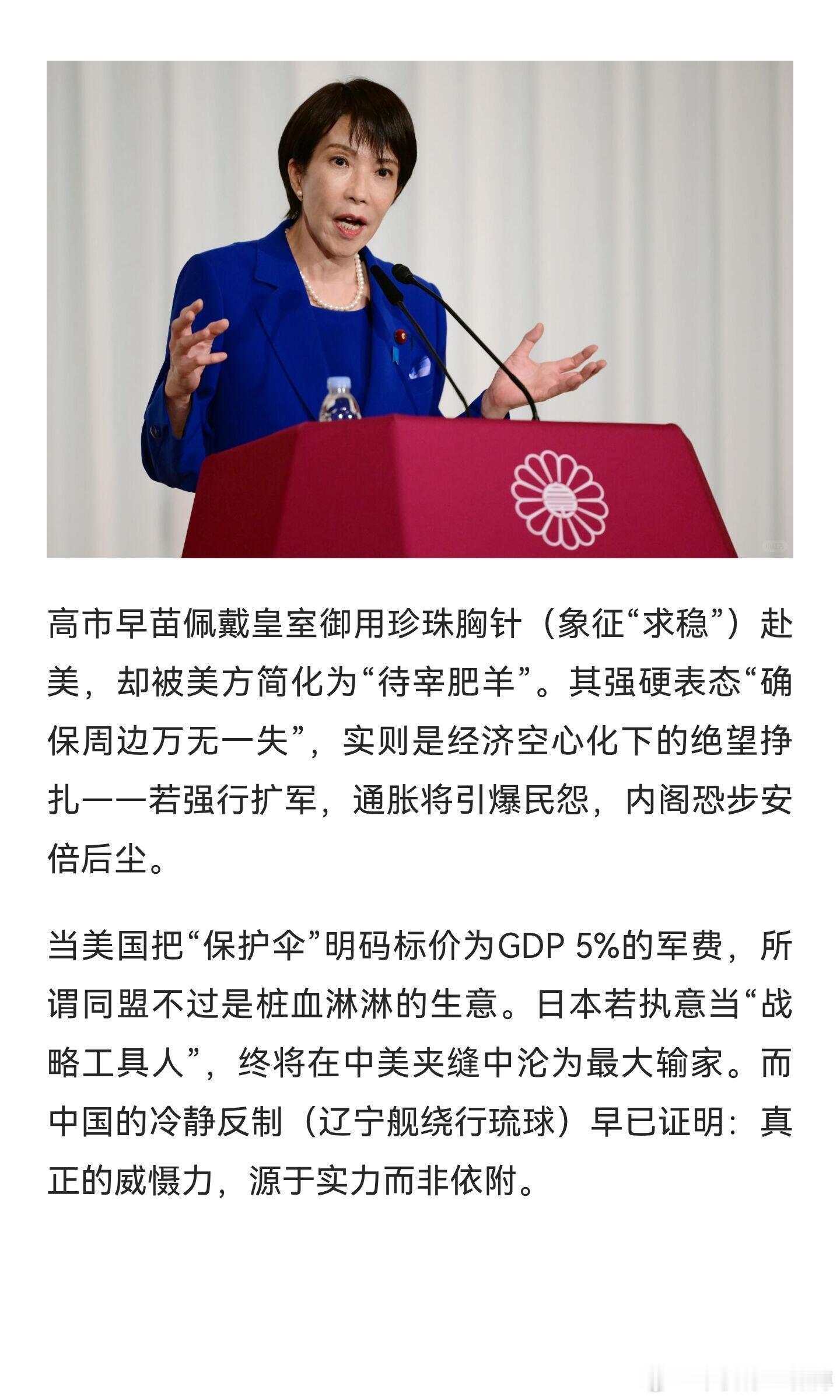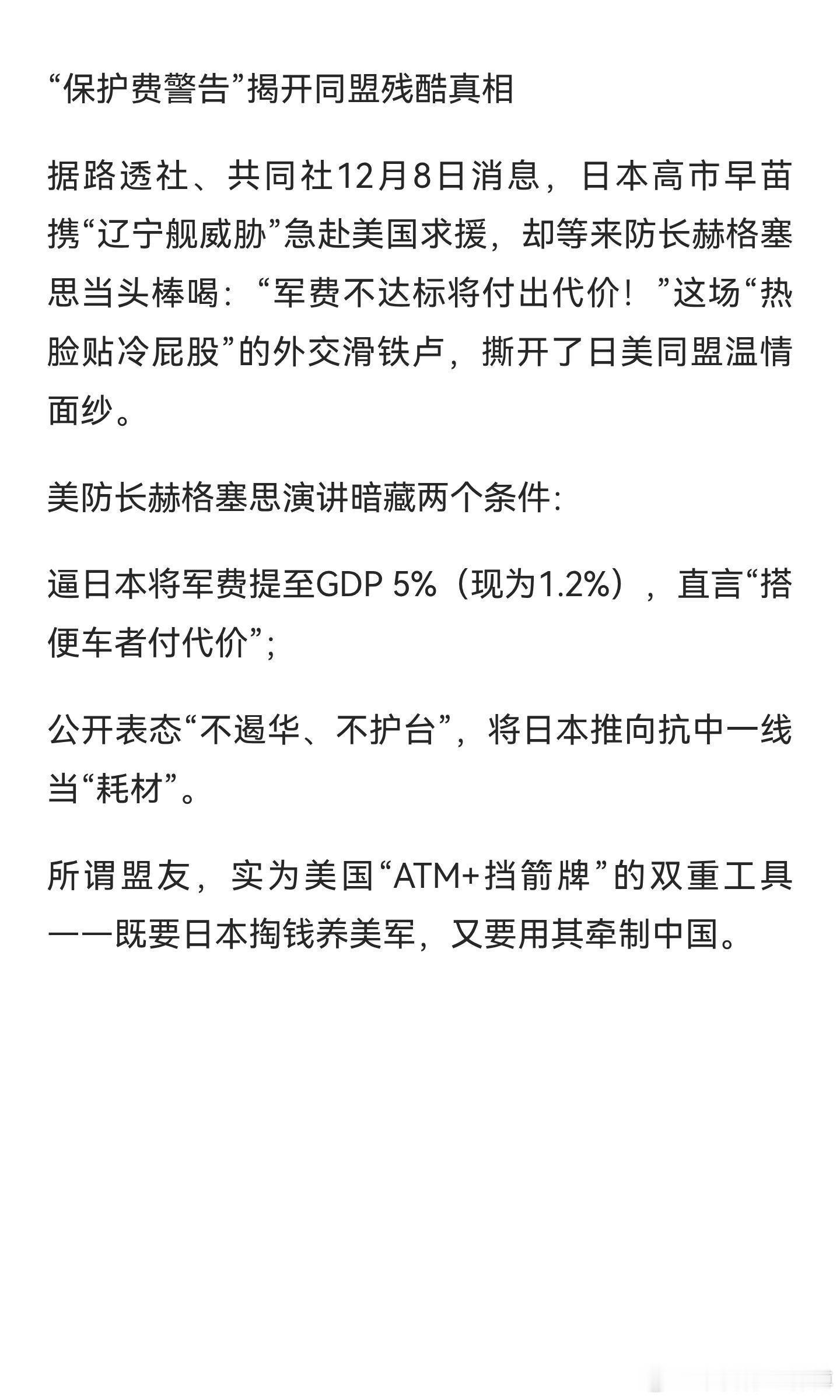 日方遭遇雷达照射,求援美国,美防长回复“你以为的同盟是大哥带小弟,真相却是大哥带着提款机”。“保护费警告”揭开同盟残酷真相:据路透社、共同社12月8日消息,日本高市早苗携“辽宁舰威胁”急赴美国求援,却等来防长赫格塞思当头棒喝:“军费不达标将付出代价!”这场“热脸贴冷屁股”的外交滑铁卢,撕开了日美同盟温情面纱。美防长赫格塞斯演讲暗藏两个条件:逼日本将军费提至GDP 5%(现为1.2%),直言“搭便车者付代价”;公开表态“不遏华、不护台”,将日本推向抗中一线当“耗材”。所谓盟友,实为美国“ATM+挡箭牌”的双重工具——既要日本掏钱养美军,又要用其牵制中国。高市早苗佩戴皇室御用珍珠胸针(象征“求稳”)赴美,却被美方简化为“待宰肥羊”。其强硬表态“确保周边万无一失”,实则是经济空心化下的绝望挣扎——若强行扩军,通胀将引爆民怨,内阁恐步安倍后尘。当美国把“保护伞”明码标价为GDP 5%的军费,所谓同盟不过是桩血淋淋的生意。日本若执意当“战略工具人”,终将在中美夹缝中沦为最大输家。而中国的冷静反制(辽宁舰绕行琉球)早已证明:真正的威慑力,源于实力而非依附。“大国博弈中,没有永远的盟友,只有永远的价码。”——东京湾的雨,淋湿的何止是首相的珍珠胸针?热点观点华俊竹有话说
