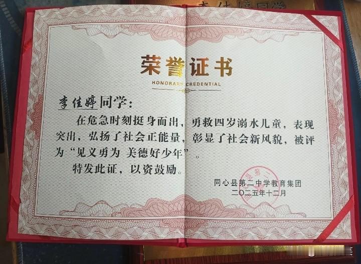 宁夏冰窟救童的女孩李佳婷,被同心县第二中学授予“见义勇为,美德好少年”称号,并被同心县人民医院颁发了“终身免费体检”的奖励! 这是“小英雄”李佳婷应得的荣誉!她才13岁,她爸爸说,她从小就很敬佩消防队员,这种榜样的力量,让她一心想着帮助别人,做一个对社会有用的人! 正如李佳婷采访时说的话:“我觉得我身子比常人要轻一点,能搭把手就搭把手。” 为了不让父亲担心,称自己不小心被洒水车淋湿了衣服。 这就是大家常说的“做好事不留名”吧!如果不是全网寻找冰窟救人的女孩,估计李佳婷同学就把这件事默默的藏在心里了。 所以,这些荣誉是李佳婷应得的!她也一定会成为国家的栋梁之材! 救人少女