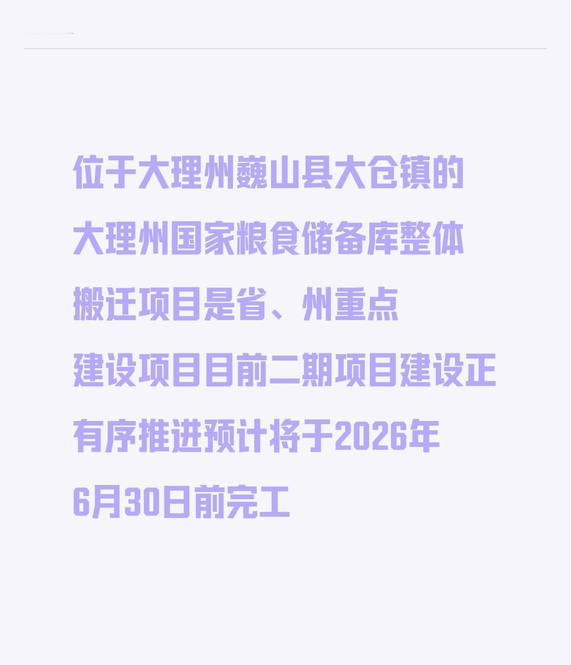 大理州国家粮食储备库搬迁项目 坐落于大理州巍山县大仓镇的大理州国家粮食储备库整体搬迁项目,是省、州重点建设项目。目前,二期项目建设正稳步推进,预计将于 2026 年 6 月 30 日前完工。 大理州国家粮食储备库整体搬迁项目(省州重点建设项目)二期正有序开展,预计 2026 年 6 月 30 日前竣工。项目全面建成后,总仓容将达 40.87 万吨。 项目核心概况➡️ 项目选址于巍山县大仓镇团结村委会,毗邻大临铁路大仓货运站,地处滇西粮油物流产业园内。 项目分两期建设,一期已于 2024 年 9 月全面建成投用,仓容 20 万吨;二期总投资约 4.6 亿元,规划用地 108.72 亩。 整体总投资估算 53191.51 万元,总建筑面积超 6.9 万平方米,涵盖仓储、辅助设施及信息化系统等全链条建设。 二期建设关键信息➡️ 建设内容:新建 32 栋浅圆仓、2 幢平房仓,配套工作塔、卸粮棚、机械器材库、配电房等辅助设施。 建设进度:目前已完成地基基础及大部分土石方、挡土墙工程,正推进浅圆仓一体滑膜准备工作。计划 2025 年 12 月 31 日前完成 2 栋平房仓土建施工,2026 年 6 月实现全面竣工。 核心指标:二期总仓容 20.87 万吨,建成后将实现智能化粮食仓储,提升储备的科学化、规范化水平。 项目核心价值➡️ 筑牢粮食安全屏障,总仓容 40.87 万吨可有效缓解省级储备仓容缺口,保障大理州乃至云南省的粮食供应稳定。 践行 “绿色储粮、科学储粮” 理念,通过信息化管理系统降低人工成本、提高流通效率,改善储粮条件。 夯实滇西粮油物流产业园区建设基础,优化区域粮食储备布局,增强应对粮食市场波动的能力。