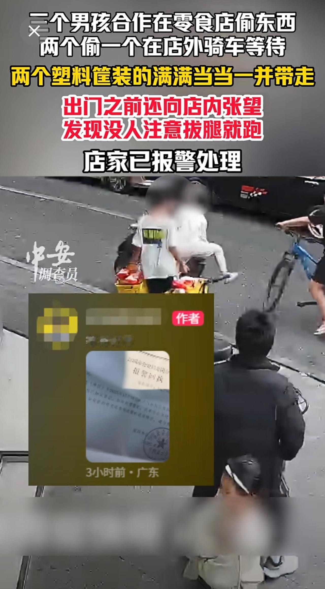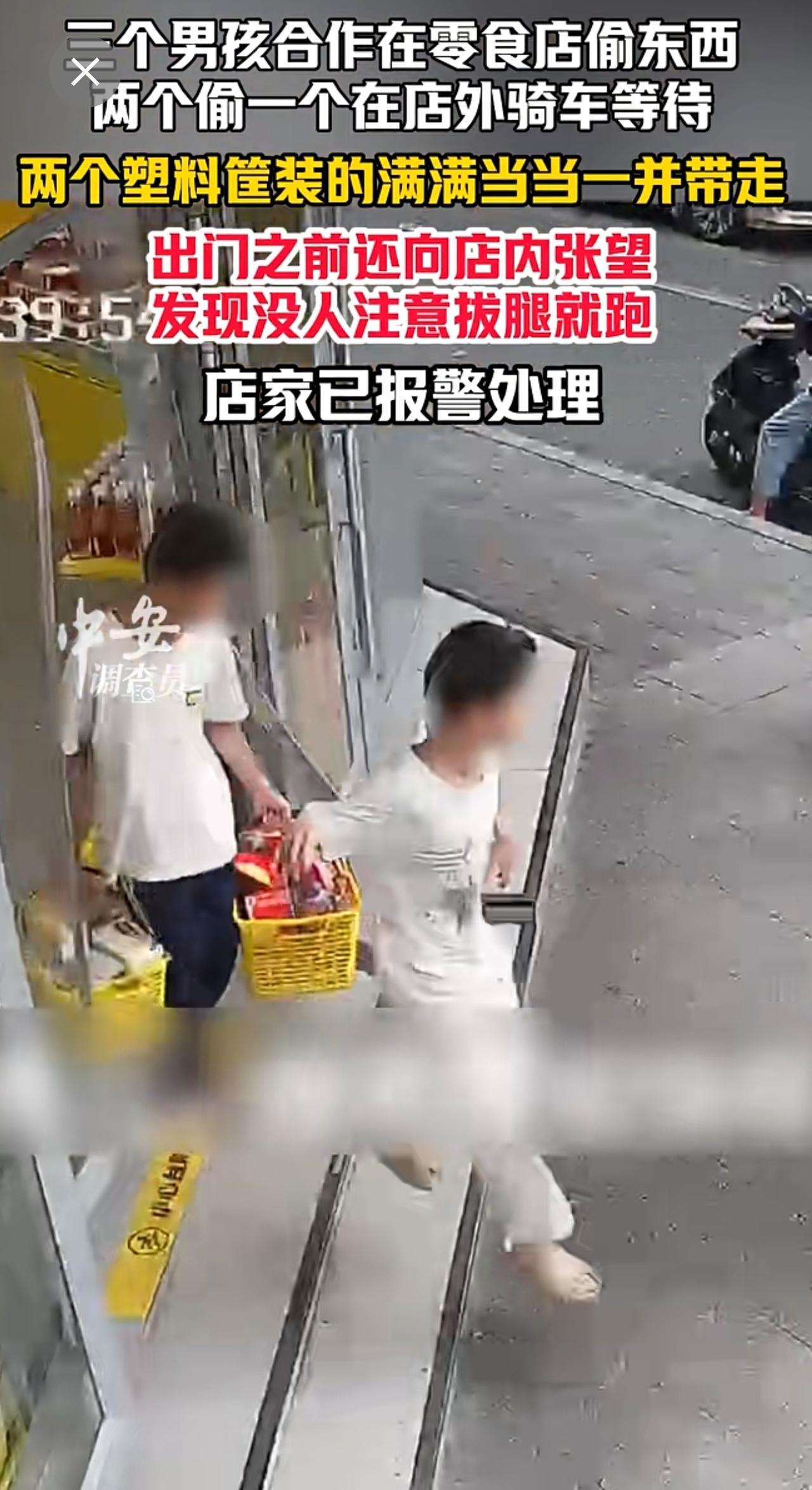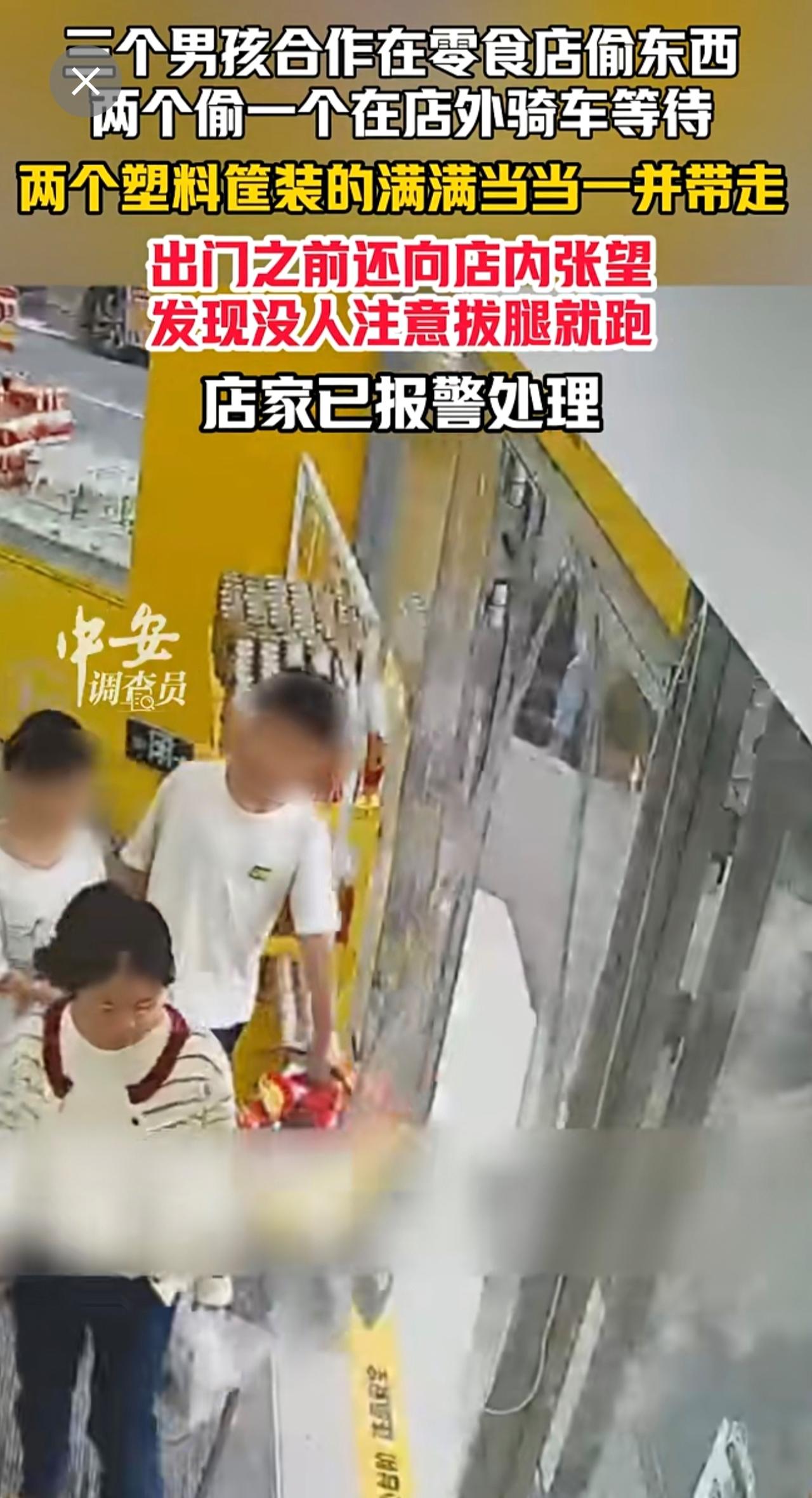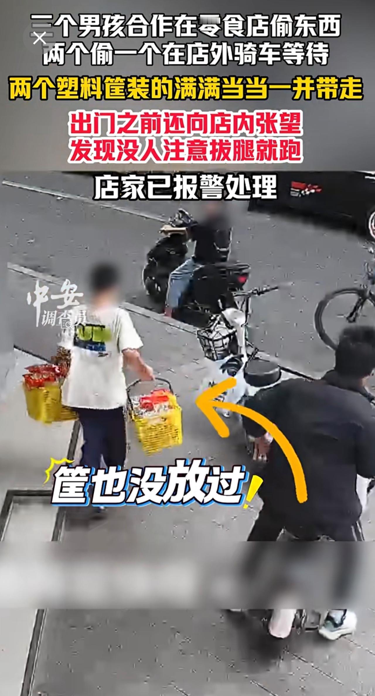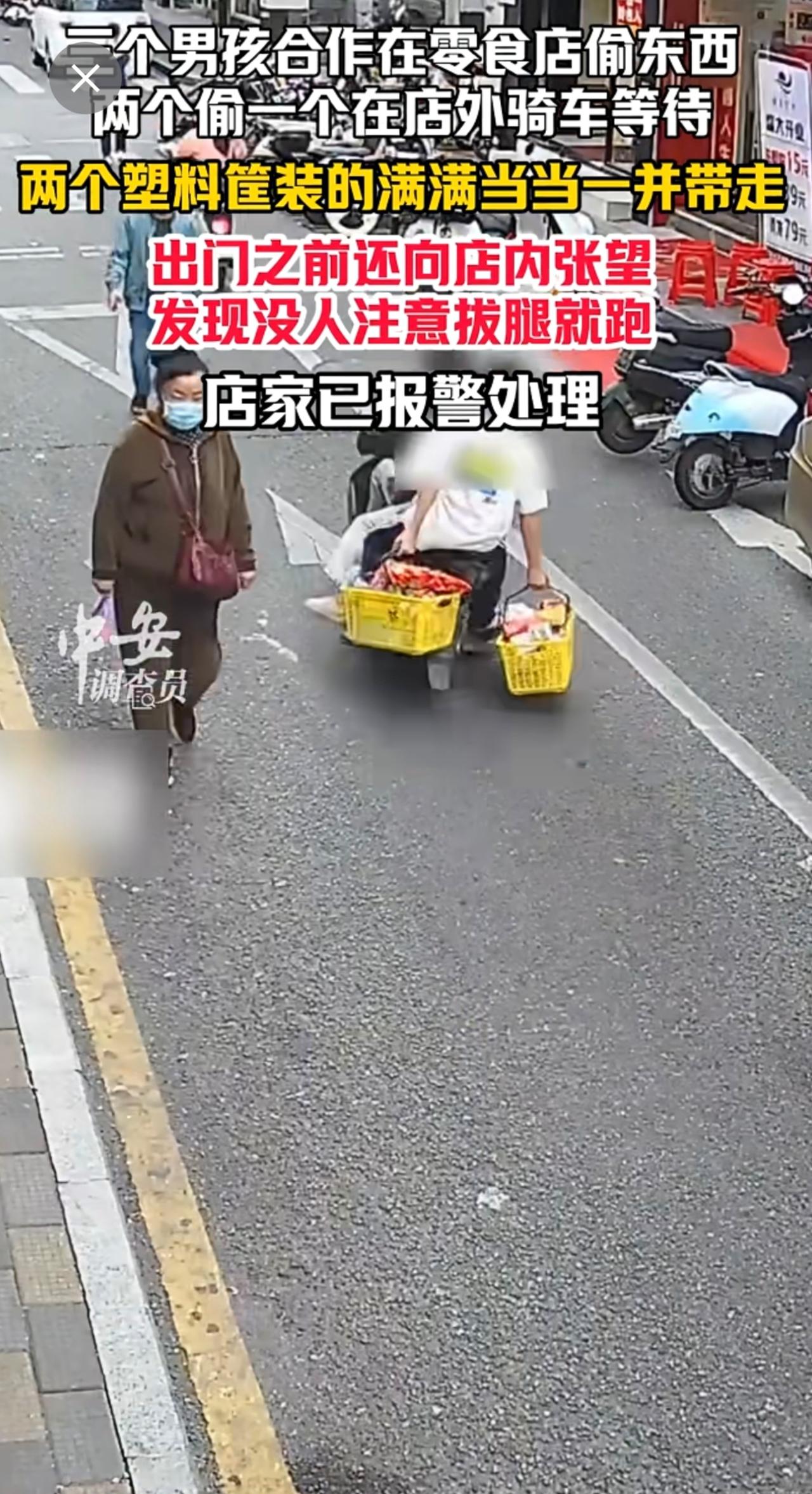 12月7日,广东深圳。三个男孩合作在零食店偷东西,两个偷一个在店外骑车等待;两个塑料筐装的满满当当一并带走。出门之前还向店内张望,发现没人注意拔腿就跑。店家已报警处理。(编辑:琳琳)