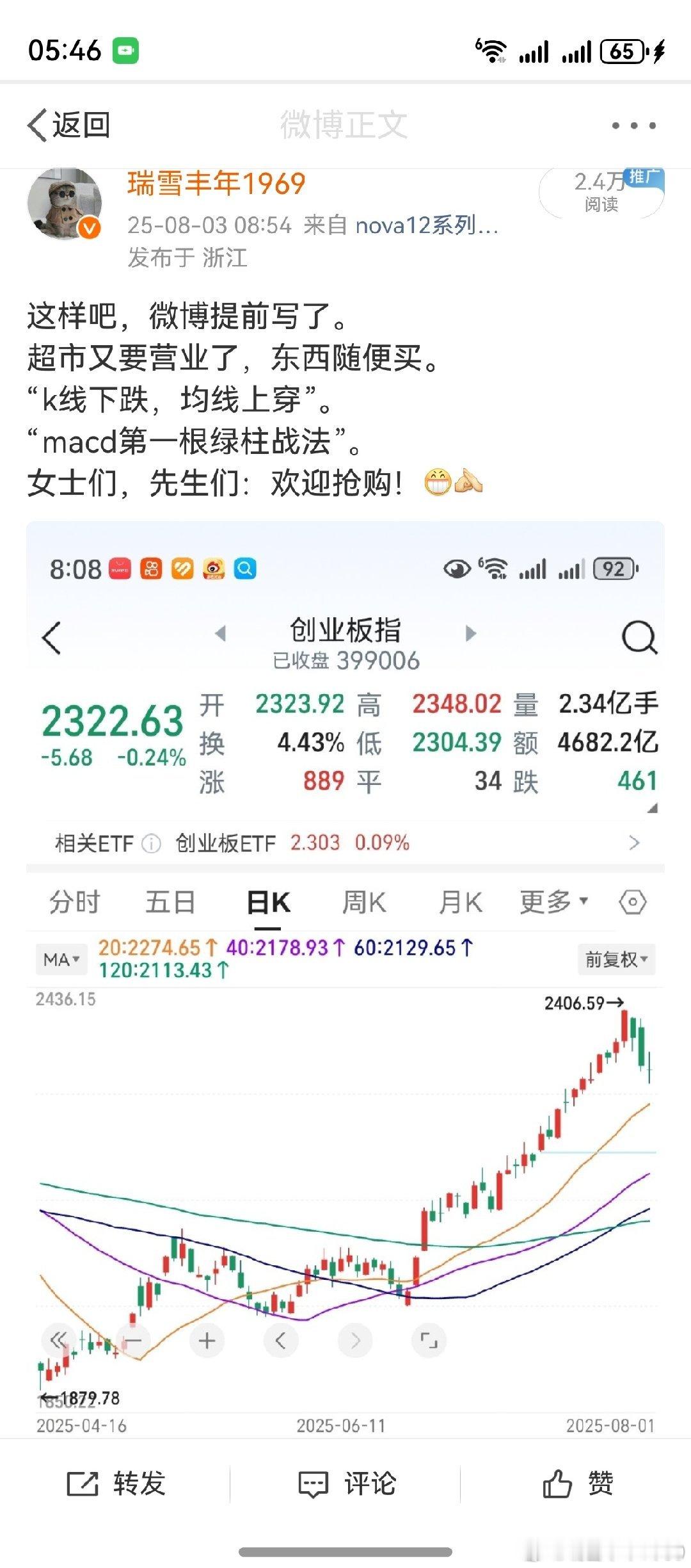 当初的创业板,堪称经典。K线下跌,60周线上穿120周线。周线macd第一根绿柱,最佳狙击点!今年8月初的创业板,同样经典。K线下跌,60天线上穿120天线。日线macd第一根绿柱,最佳狙击点!老鸭的技术口诀,不是吃素的。喜欢创业板的原因,就在于它的经典。