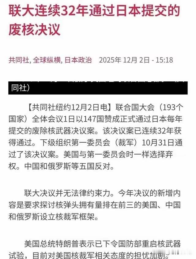 1. 日本主导核裁军决议在联大通过 高市早苗却高兴不起来:日本主导的核裁军决议联大通过(连续32年),要求中美俄谈核裁军框架,中俄反对并协调立场阻止日本军国主义。高市早苗推动决议想占道德高地,却因美国态度暧昧(重启核试验)、国际国内压力大,高兴不起来。