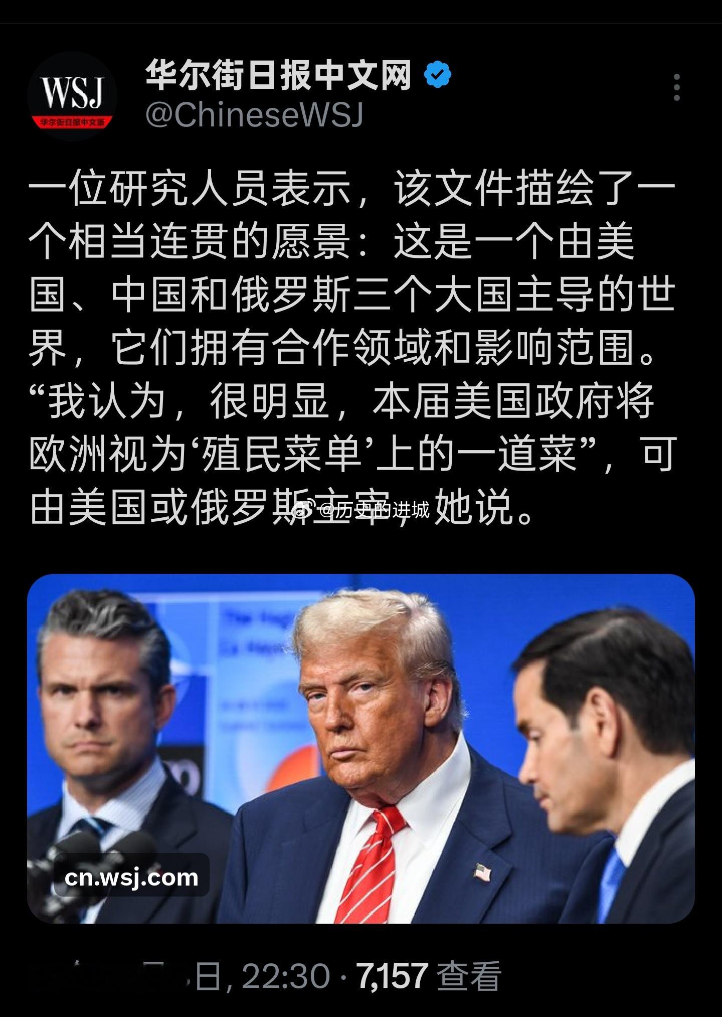 WSJ称多年来,美国政府每年都会发布一份《国家安全战略》,阐述华盛顿如何看待世界。上周,特朗普政府发布的版本似乎将其最严厉的措辞留给了一个新目标:美国在欧洲最亲密的盟友。一位研究人员表示,该文件描绘了一个相当连贯的愿景:这是一个由美国、中国和俄罗斯三个大国主导的世界,它们拥有合作领域和影响范围。“我认为,很明显,本届美国政府将欧洲视为‘殖民菜单’上的一道菜”,可由美国或俄罗斯主宰,她说。