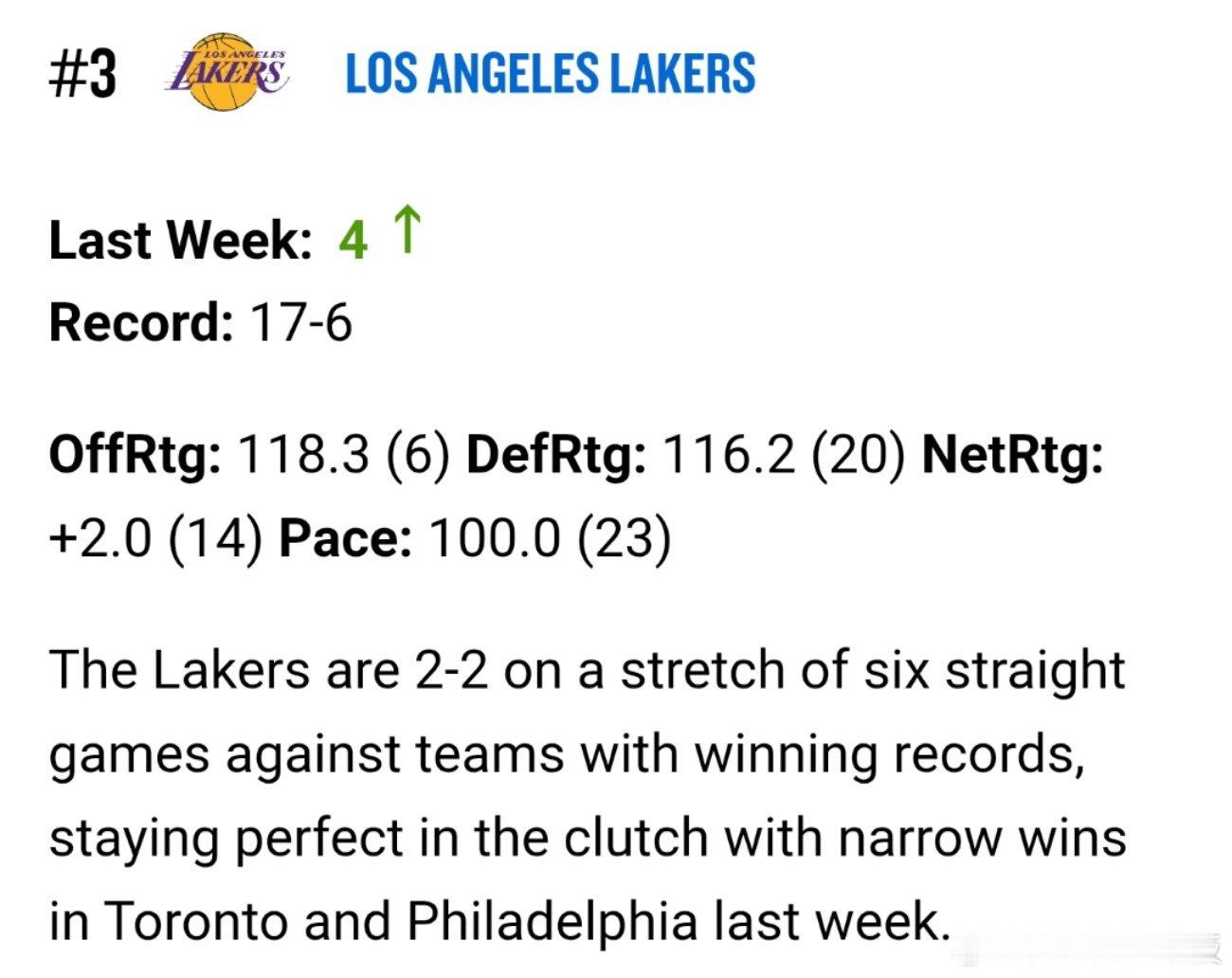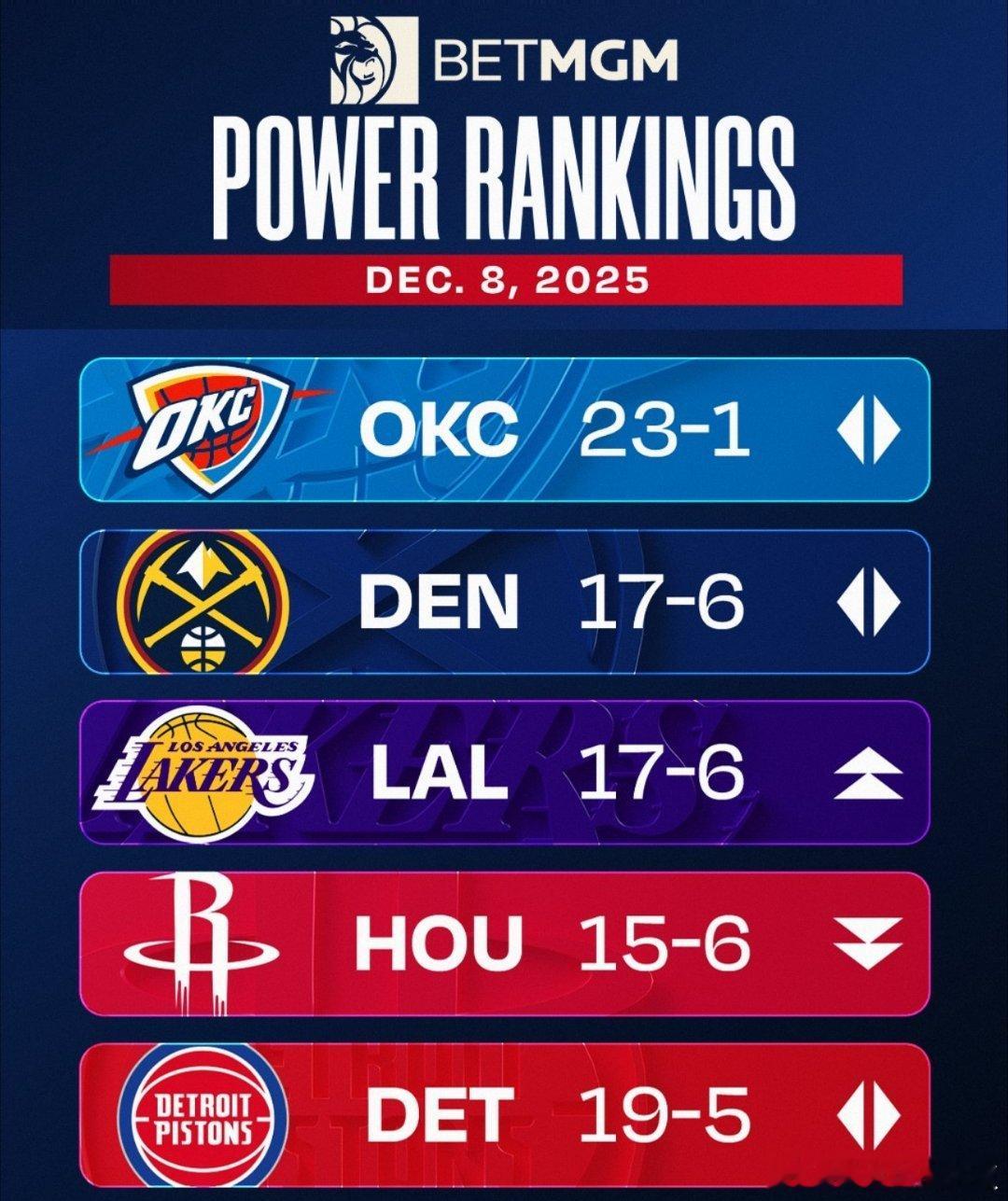 NBA官方更新上周球队实力排行榜,雷霆、掘金、湖人、火箭、活塞前5,凯尔特人暴涨7名排名第6。其余球队: 勇士第16,独行侠第19,开拓者第20,快船第24新赛季篮不住