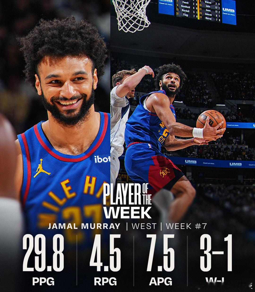 杰伦-布朗和贾马尔-穆雷当选上周东西部周最佳球员!布朗上周场均34分6.7板5.7助,绿军3胜0负;穆雷上周场均29.8分4.5板7.5助,掘金3胜1负。亚历山大、霍姆格伦、杰伦-威廉姆斯、布伦森、马克西等获得提名新赛季篮不住