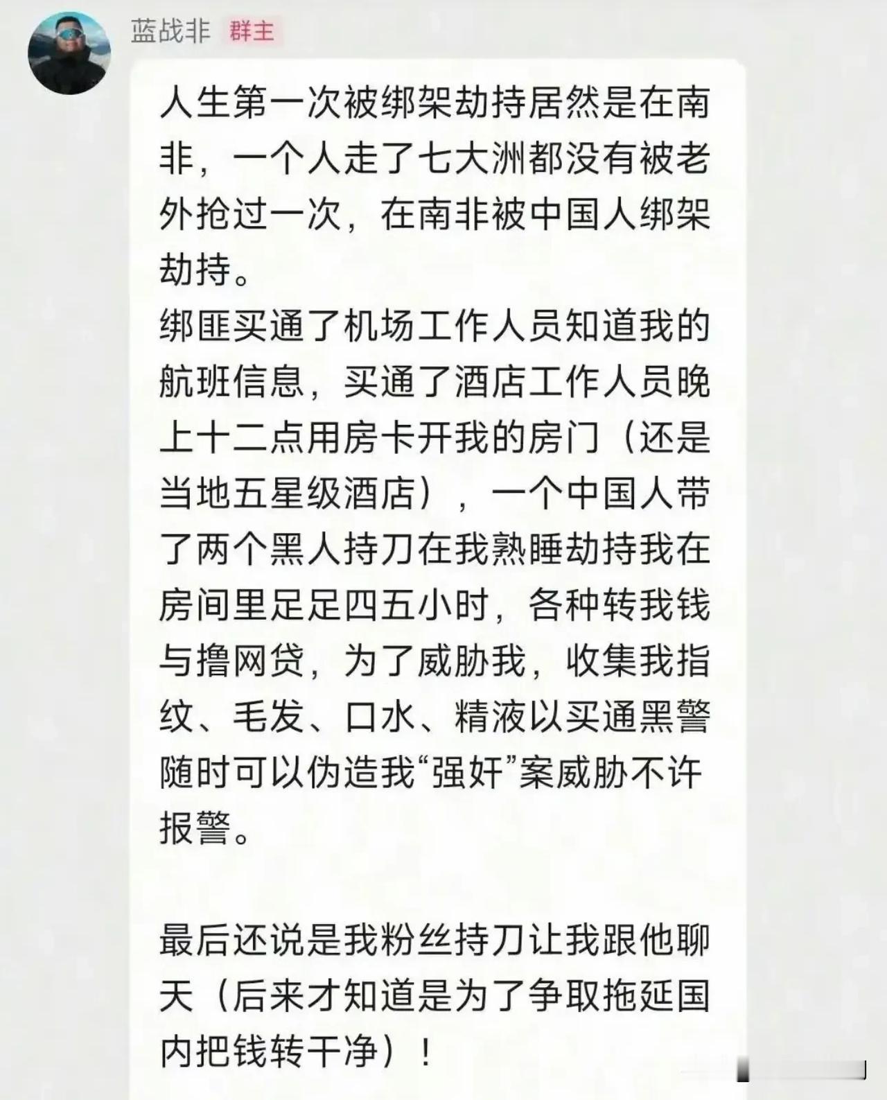 半夜从朋友圈知道了蓝战非被绑架的消息,太震惊了,被一个中国籍的人带两个黑人给绑架了,好像是精心策划了很久的,出门在外,真的是要防备被算计。 还好最后通过大使馆和当地华人的帮助下,获得了安全。