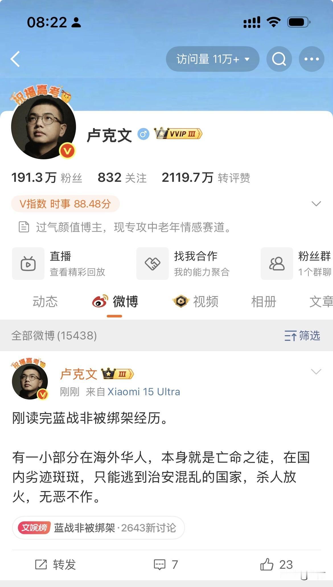 卢克文公众号被限制打开,但其微博是正常。 在微信公众号拥有超过450万粉丝的卢