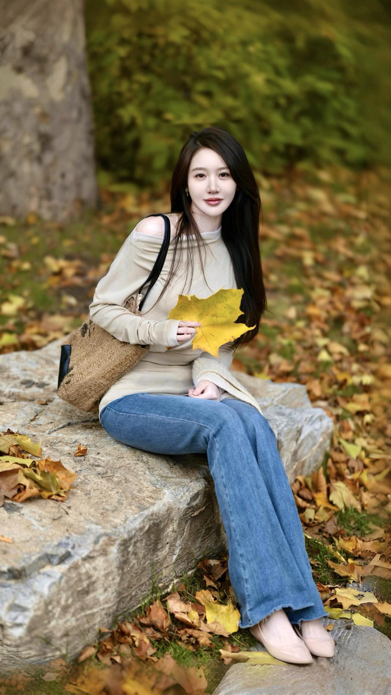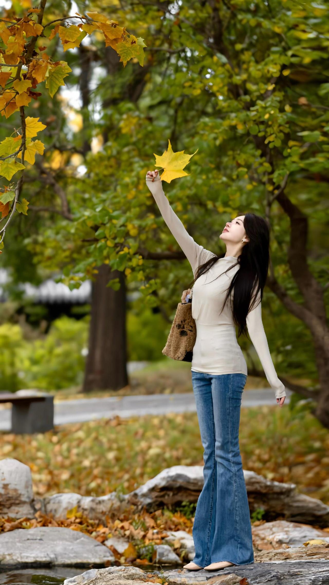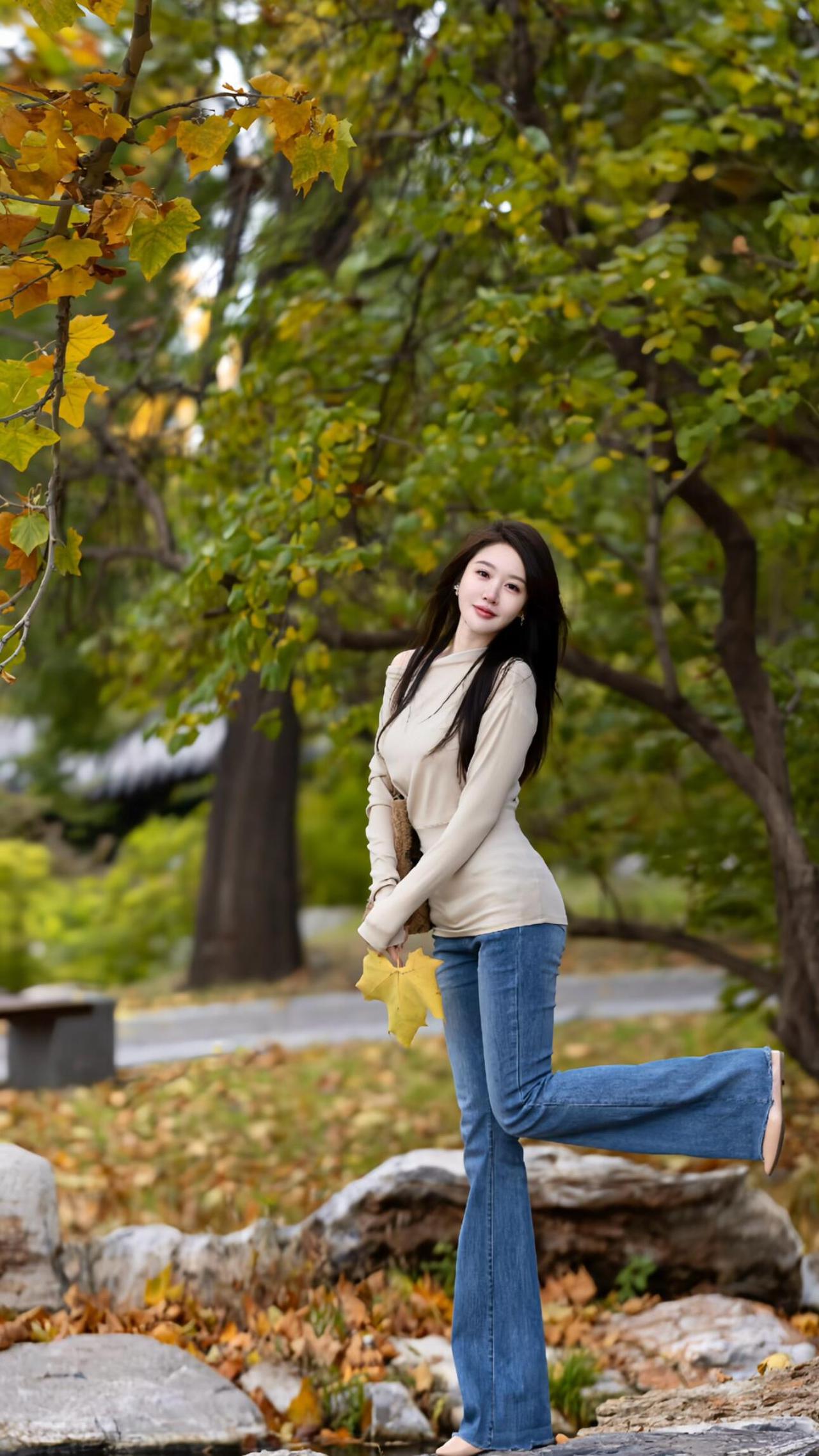 秋意漫行 米白针织的软,裹住秋阳的暖 牛仔蓝掠过青石,踩碎满地金黄 她拾起一片梧桐叶 像接住整个秋天的温柔 靠在老树的躯干 风穿过枝叶的缝隙 发梢拂过肩头,抖落细碎的光 溪水在身后轻淌 把树影揉成摇晃的诗行 坐在落叶堆里时 指尖捏着的黄,是未凉的欢喜 转身走向林间的背影 被秋光裹成柔软的轮廓 这一程,不问归期 只把心事,轻放在 每一片飘落的叶,每一阵掠过的风里 是人间寻常,也是独属的浪漫牛仔高级感 秋色漫步 轻踏落叶 牛仔光影绝韵