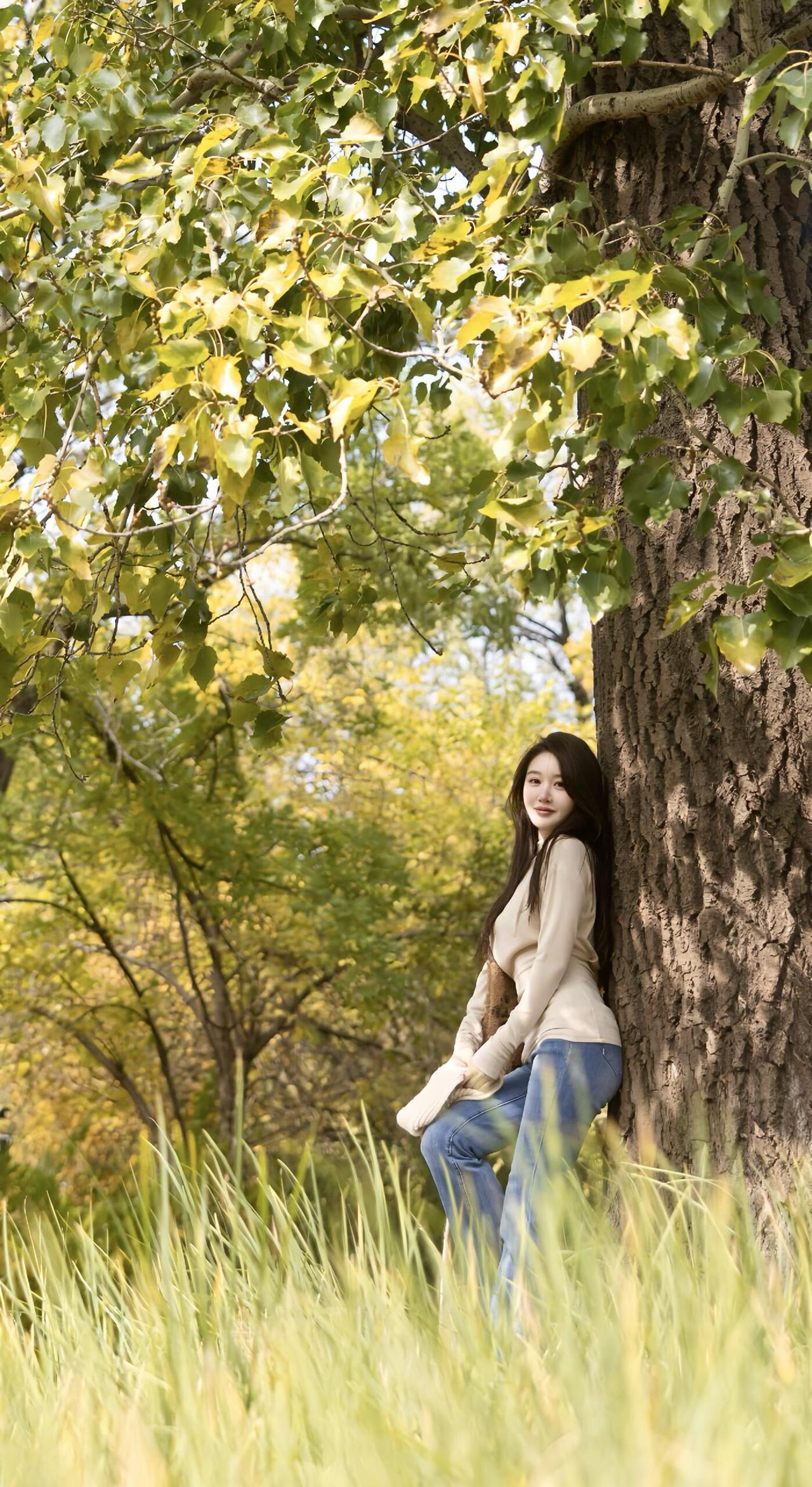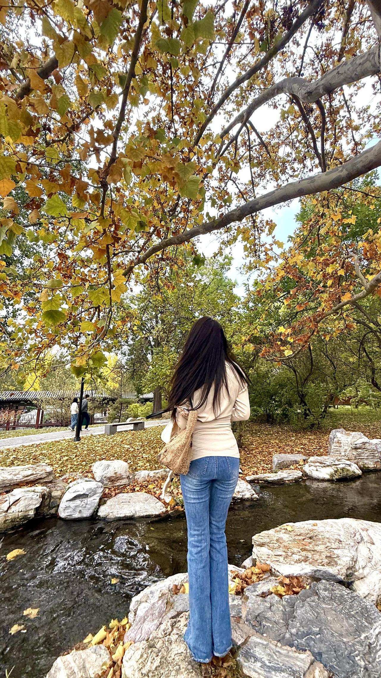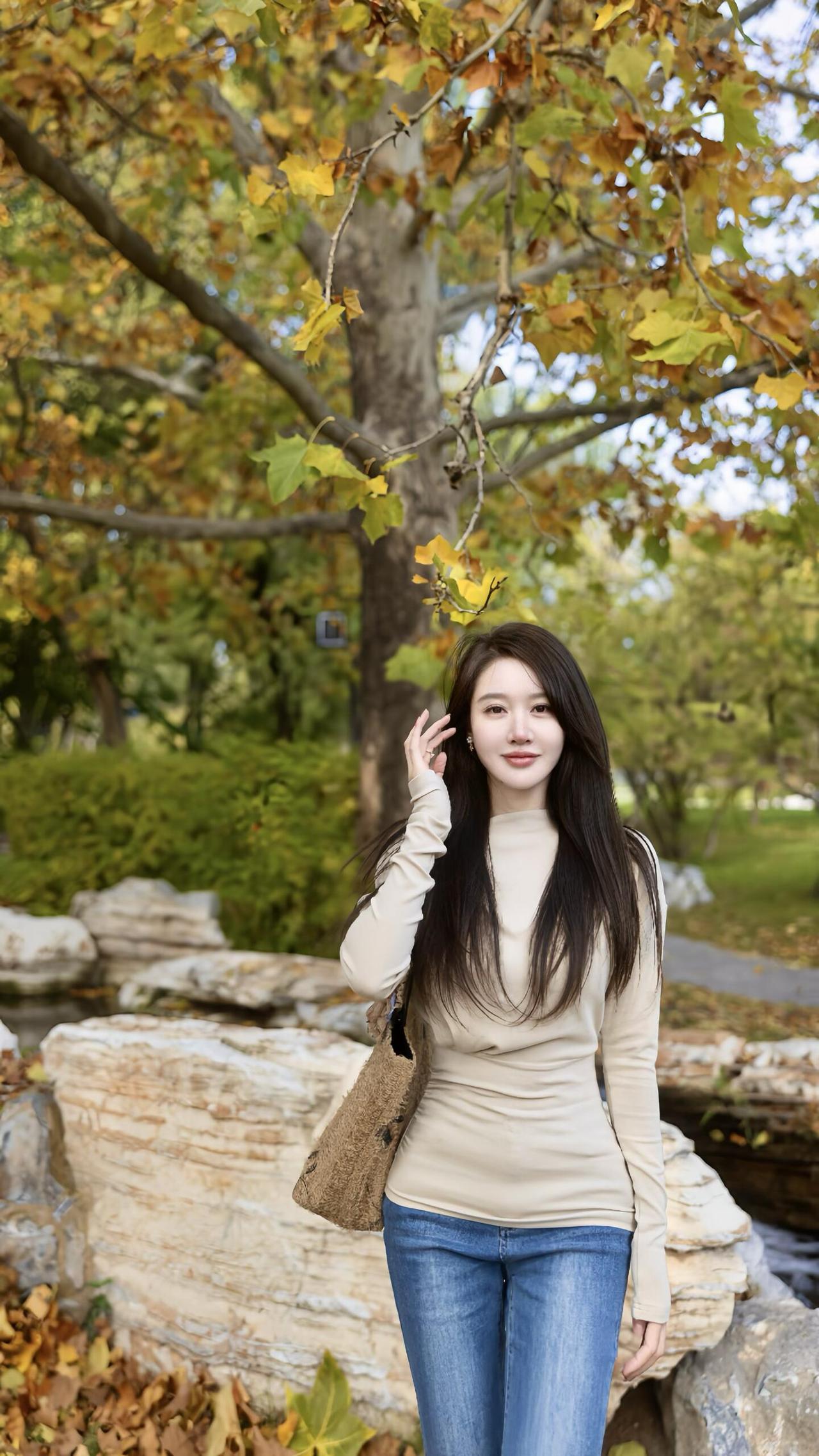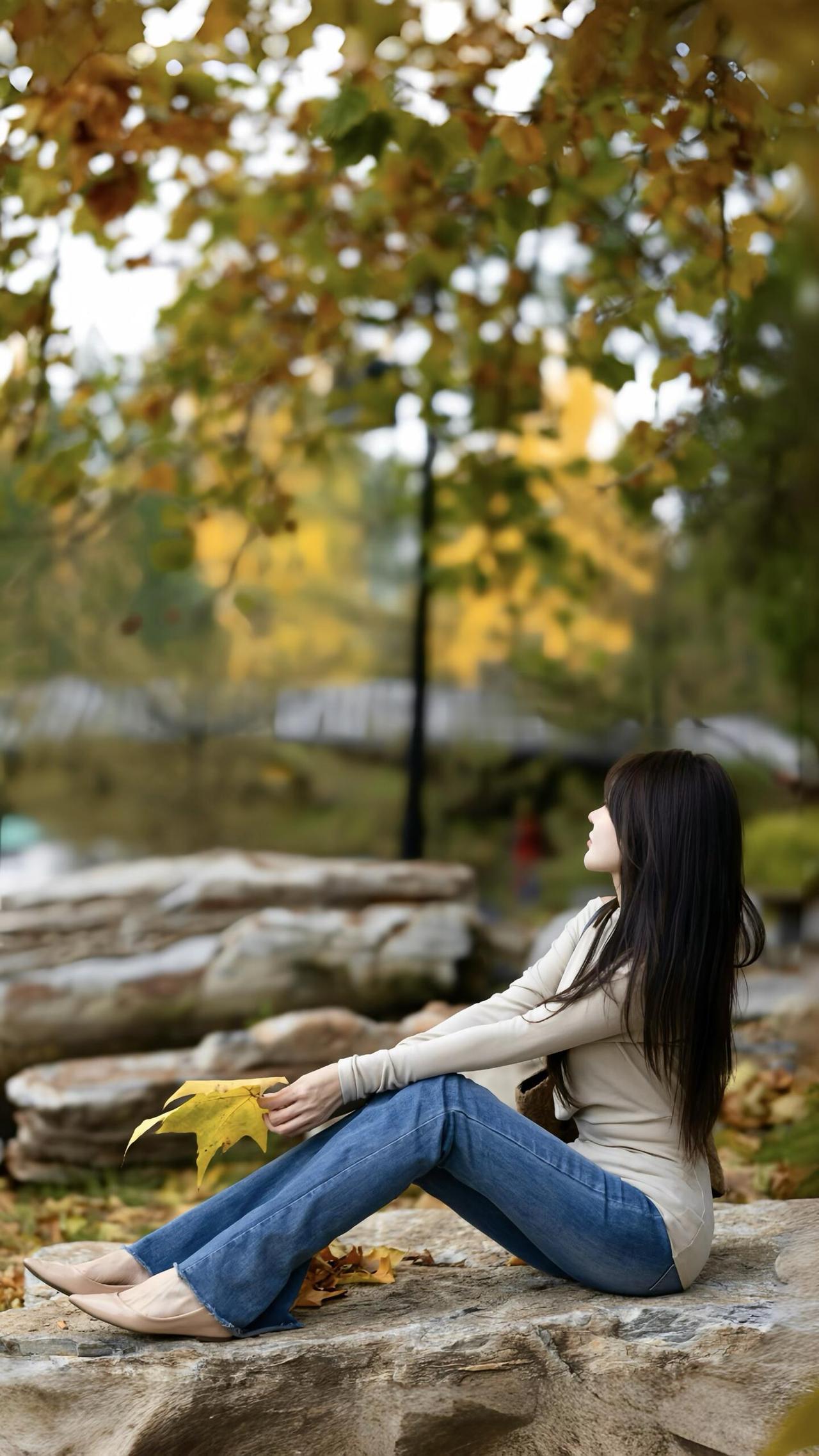 秋意漫行 米白针织的软,裹住秋阳的暖 牛仔蓝掠过青石,踩碎满地金黄 她拾起一片梧桐叶 像接住整个秋天的温柔 靠在老树的躯干 风穿过枝叶的缝隙 发梢拂过肩头,抖落细碎的光 溪水在身后轻淌 把树影揉成摇晃的诗行 坐在落叶堆里时 指尖捏着的黄,是未凉的欢喜 转身走向林间的背影 被秋光裹成柔软的轮廓 这一程,不问归期 只把心事,轻放在 每一片飘落的叶,每一阵掠过的风里 是人间寻常,也是独属的浪漫牛仔高级感 秋色漫步 轻踏落叶 牛仔光影绝韵