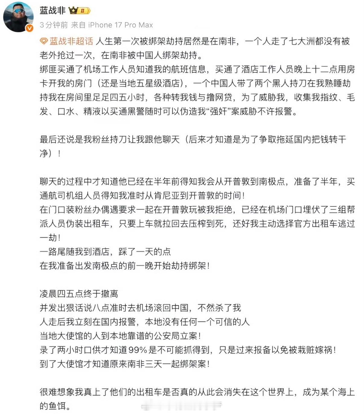 蓝战非被绑架 都说“老乡见老乡,两眼泪汪汪”,这身在异地 竟然被同胞绑架了,这太离谱了…………