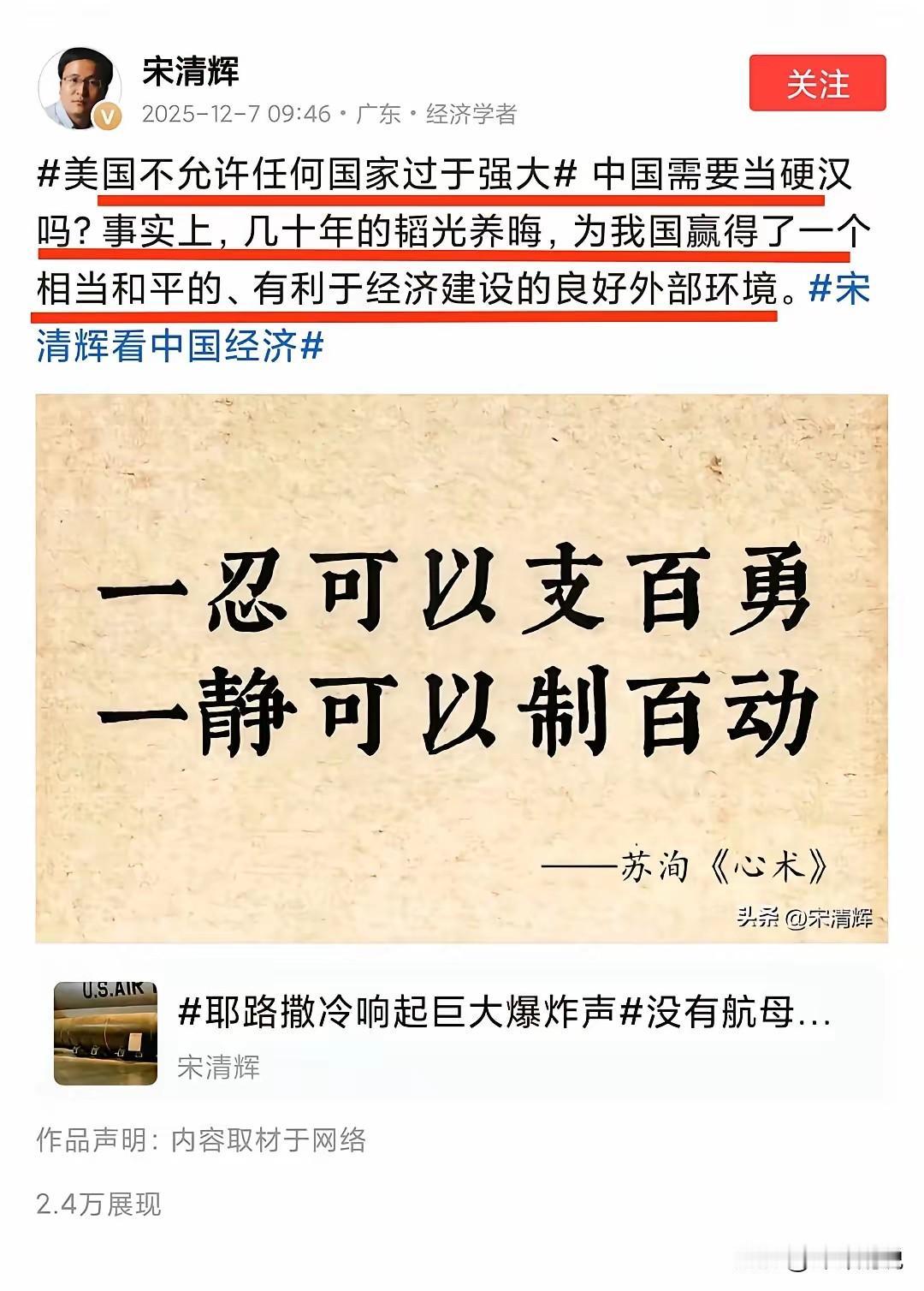 公知说:美国是不会允许任何国家过于强大,那我们还有必要当硬汉吗? 作为一名经济学者,居然能说出这样的话,可见你的立场已经偏到离谱了。要是别人说什么,你就听之任之照做,那你迟早会输得一无所有,这么浅显易懂的道理,难道公知们不明白吗? 美国会不会允许其他国家发展得过于强大,那是美国单方面的想法。关键在于,我们自己想不想变得更强大。倘若我们有追求强大的意愿,那与美国产生竞争关系就是必然的;可要是我们选择停滞不前,那美国也绝不会心慈手软放过我们。看看如今的日本就知道了,公知们只要不是故意装作看不见,就应该清楚美国真正的企图是什么。
