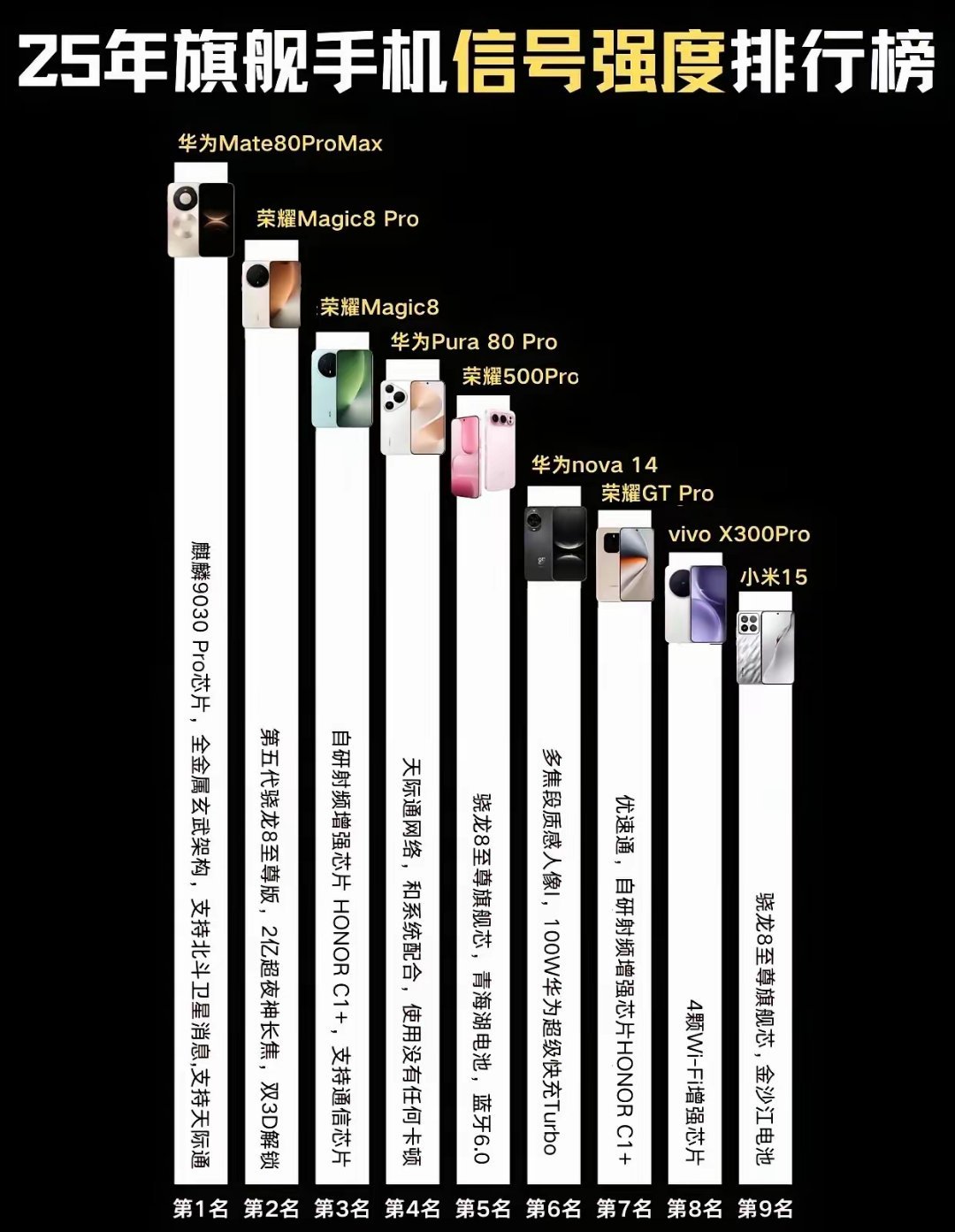 要说手机信号哪家强?必须是华为和荣耀!这手机信号强度排行榜前十,华为和荣耀手机占据八席,华为Mate80promax、荣耀magic8pro、荣耀magic8分获前三位!(图源网络)