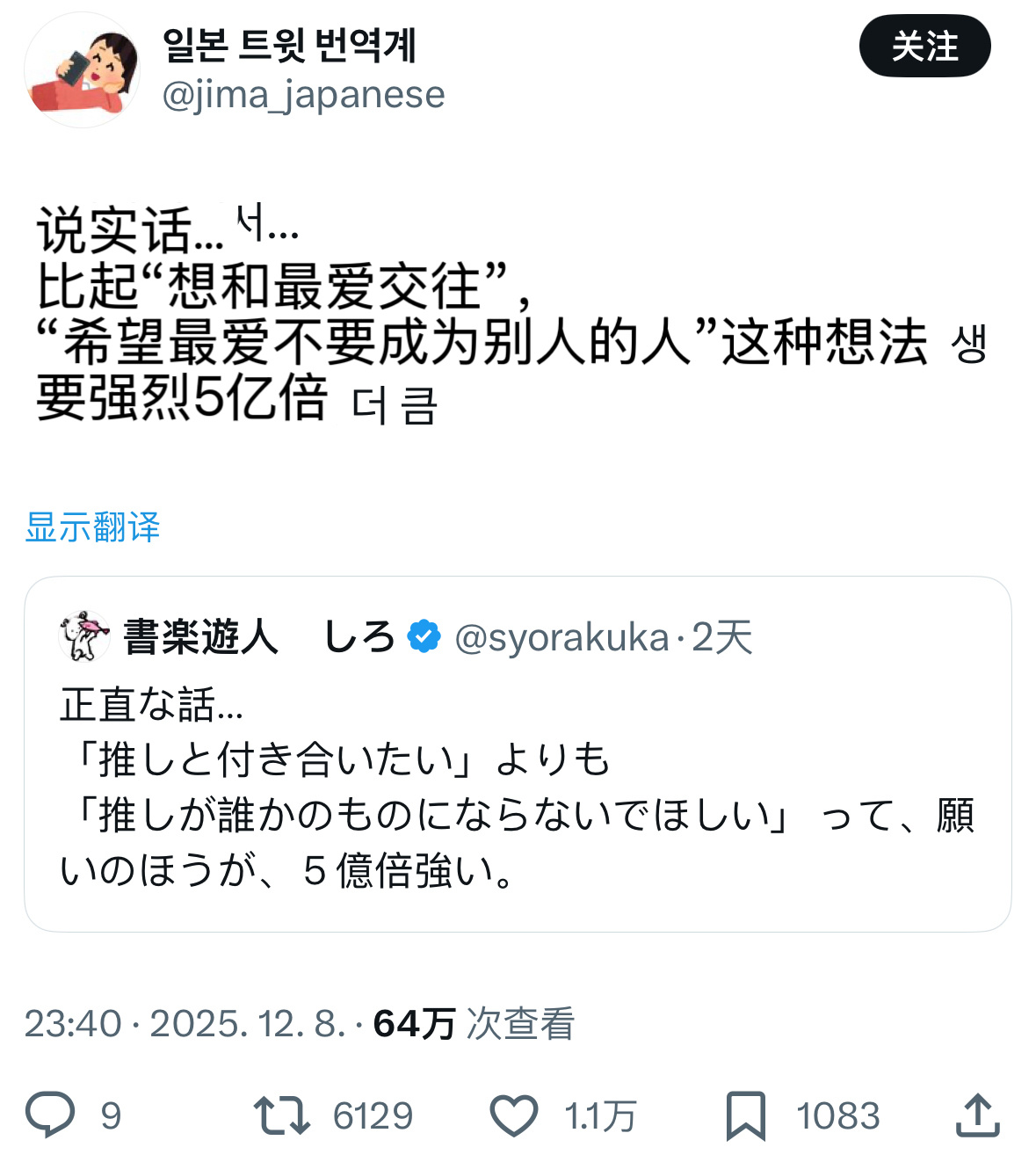 【twi】推上引起许多追星女同感的推文说实话…比起“想和最爱交往”,“希望最爱不要成为别人的人”这种想法要强烈5亿倍