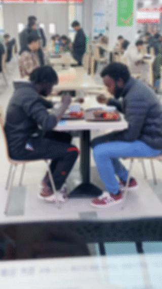 两个非洲黑人留学生正在学校食堂吃饭。 看他们拿筷子吃饭的姿势非常的熟练? 看起来已经是在中国生活很长一段时间了。