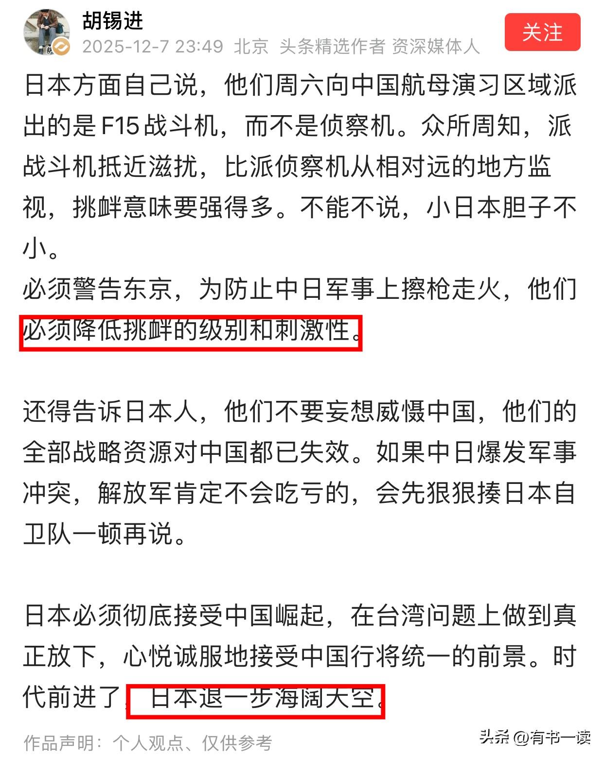 胡锡进发文措辞是不严谨,还是有意而为之?是提醒还是妥协?挑衅还有“分级”?老胡这波“降级”论,是在消解国威还是在和稀泥? “降低挑衅级别”?这词儿听着怎么这么别扭?合着日本鬼子骑在咱们脖子上拉屎,老胡的意思是让他们“轻点儿拉,别太臭”就行? 日本挑衅本就不对,是理亏的一方,怎么还能让日本降低挑衅级别呢?降低挑衅到底是什么意思?慢慢挑衅?继续骚扰?什么立场? 他的这段话理解过来是不是就是,日寇可以肆意挑衅中国,但是级别和刺激性必须降低,一定要把握好度!幅度小点就行呢? 从胡编的语气里,看不出什么是家国仇恨,好象一位旁观者,局外人,在劝两个人,不要打架一般。细品之下,怎么透着一股子“劝架和事佬”的软绵绵味道? 老胡说“为了防止擦枪走火,要降低刺激性”。这话的潜台词简直可怕:默认了日本可以继续挑衅,只是不要搞得太激烈。 “日本退一步海阔天空”,这难道是站在日本的立场,劝中方讲“格局”、示大度? 对于日本这种得寸进尺的对手,唯一的“降级”,就是让他们“彻底闭嘴、灰溜溜地滚蛋”! 如何评价胡锡进
