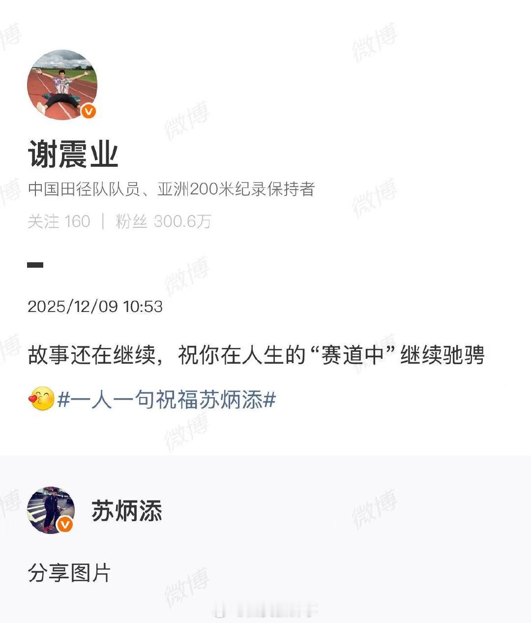 【谢震业给苏炳添送祝福】谢震业祝苏炳添在人生赛道中继续驰骋12月9日,中国短跑名将、亚洲“飞人”宣布正式退役。随后,中国田径队队员、亚洲200米纪录保持者发文祝福:“故事还在继续,祝你在人生的“赛道中”继续驰骋”