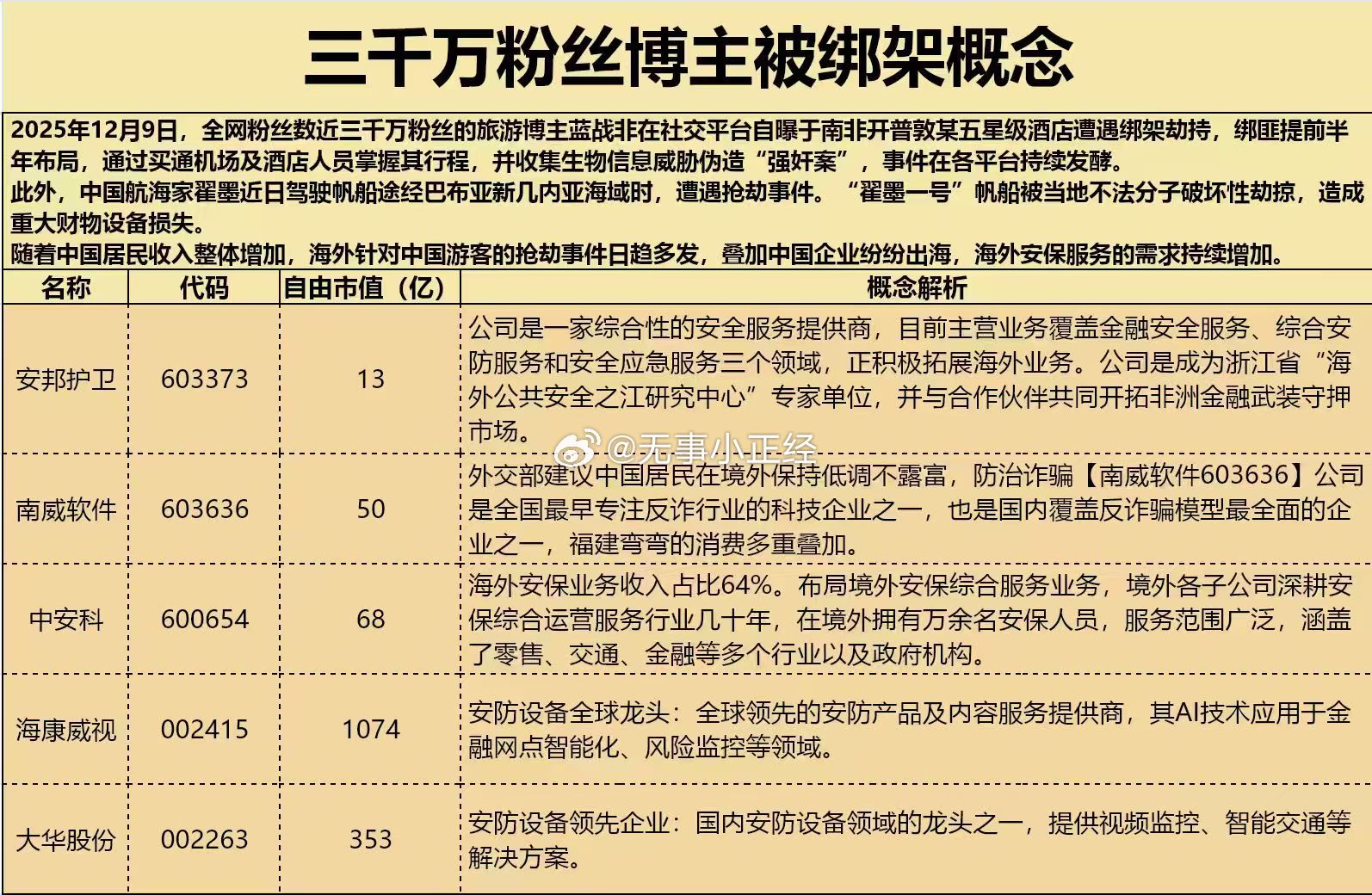 蓝战非称被绑架概念股来了!随着中国居民收入整体增加,海外针对中国游客的抢劫事件日趋多发,叠加中国企业纷纷出海,海外安保服务的需求持续增加。