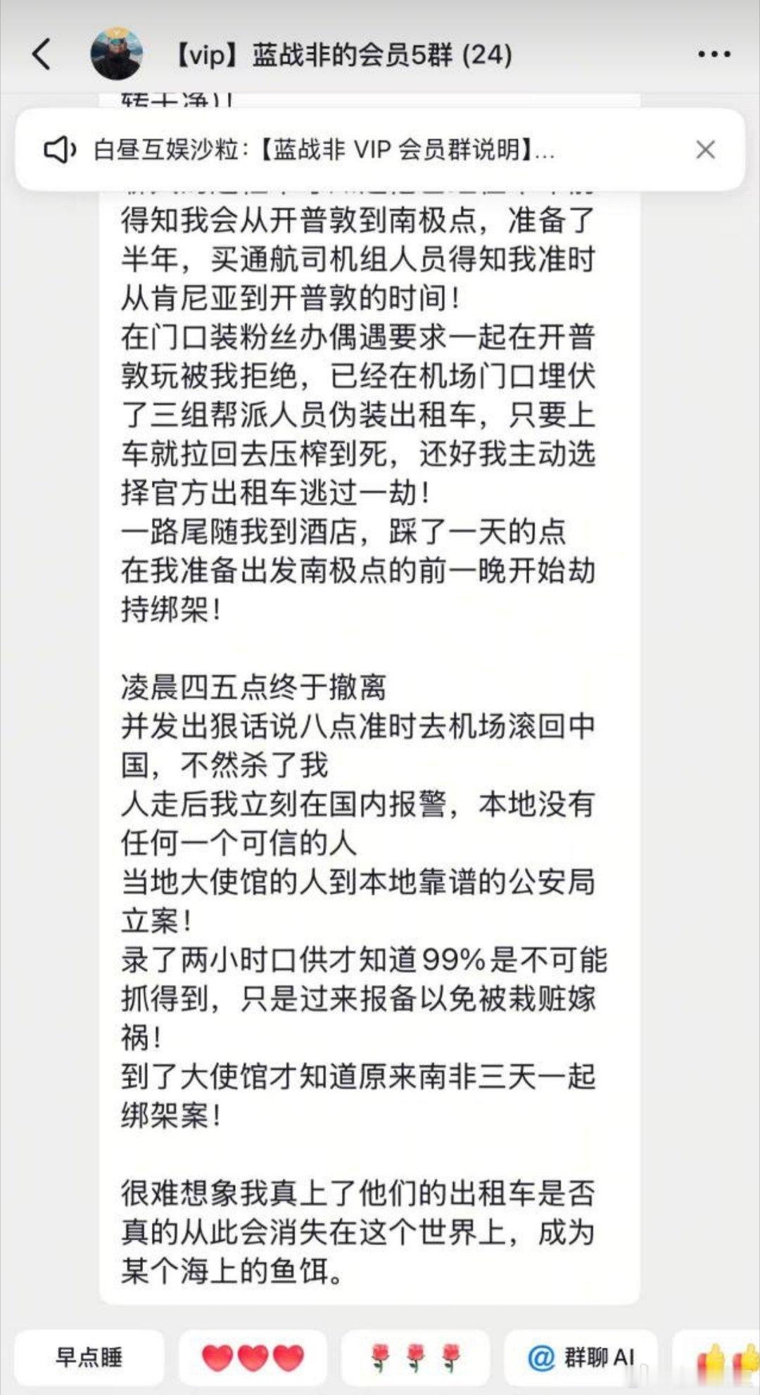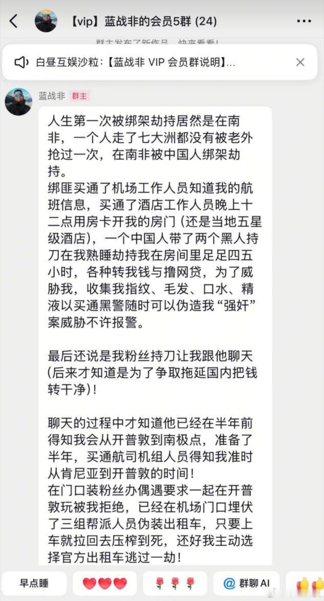 蓝战非称被绑架 太可怕了,蓝战非自曝在南非被中国同胞绑架劫持,而且绑匪居然已经提前半年布局,买通机场人员搞到了行程,又买通五星级酒店人员,潜入酒店房间直接绑架劫持!制造虚假强奸案件,来勒索蓝战非300万!在国外果然要格外小心,不要轻易相信任何人!蓝战非回应