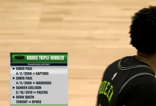 NBA常规赛,主场迎战的比赛正在进行中。比赛的第四节,转播画面给出一组数据,内容为鹈鹕新秀第一年拿到过三双的球员,详情如下: 2006年4月2日对阵猛龙克里斯-保罗 2006年4月5日对阵勇士达伦-科里森 2010年2月19日对阵步行者以及今晚已经砍下29+10+10的德里克-奎因。新赛季篮不住我的观赛搭子